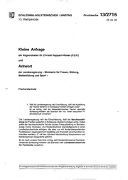 SCHLESWIG-HOLSTEINISCHER LANDTAG Drucksache 13/2716 13. Wahlperiode 25.04.95 Kleine Anfrage der Abgeordneten Dr. Christel Happach-Kasan (F.D.P.) und Antwort der Landesregierung - Ministerin für Frauen, Bildung, Weiterbildung und Sport- Fischereischule 1. Teilt die Landesregierung die Einschätzung, daß die Ausbildung der Fischer weiterhin in Schleswig-Holstein erfolgen sollte? Ist es Jichtig, daß die Niedersächsischen Fischer ebenfalls Schleswig-Holstein als Standort der von ihnen besuchten Fi- schereischule vorziehen? Die Landesregierung teilt die Einschätzung, daß die Berufsausbil- dung der Fischerweiterhin in Schleswig-Holstein erfolgen sollte. Dabei sollte der berufsschulische Teil der dualen Erstausbildung im Betriebs- zweig Kleine Hochsee- und Küstenfischerei standortgerecht in einer Landesberufsschule erfolgen, die aber nur mit länderübergreifenden Fachklassen organisatorisch tragfähig und finanziell verantwortbar ist. Hierüber werden z.Z. mit den Ländern Mecklenburg-Vorpommern und Niedersachsen Gespräche geführt. Es ist nach unserer Kenntnis richtig, daß Niedersächsisch40l Fi.scherei- verbände Schleswig-Holstein als Stahdort oder Landesberufsschule für Fischwirte vorziehen. Oie Landtagsdrucksachen sind fortlaufend und einzeln beim Vertag Schmidt & K!aunig, Ringstraße 19, 24114 Kiel, Fernruf 04 31/6 20 95, zu beziehen.