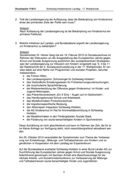 Drucksache 17/813 Schleswig-Holsteinischer Landtag - 17. Wahlperiode 2. Teilt die Landesregierung die Auffassung, dass die Bekämpfung von Kinderarmut eines der primärsten Ziele der Politik sein muss? Antwort: Nach Auffassung der Landesregierung ist die Bekämpfung von Kinderarmut ein primäres Politikziel. 3. Welche Initiativen auf Landes- und Bundesebene ergreift die Landesregierung um Kinderarmut zu bekämpfen? Antwort: Sozialminister Dr. Heiner Garg hat am 18. Februar 2010 im Sozialausschuss im Rahmen der Diskussion um die Ausgestaltung des Europäischen Jahres gegen Armut und Soziale Ausgrenzung ausführlich den sozialpräventiven Strategiean- satz der Landesregierung zur Inklusion von Kindern vorgestellt (vgl. S. 4 bis 11 der Niederschrift der 5. Sozialausschusssitzung in der 17. Wahlperiode). Er ver- wies dabei auf eine Reihe von Programmen und sozialen Projekten, darunter insbesondere: • die Frühen Hilfen, • das Landesprogramm „Schutzengel für Schleswig-Holstein“, • das Verbindliche Einladungswesen für Früherkennungsuntersuchungen, • die vorschulische Sprachförderung, • die Weiterentwicklung der Offensive gegen Kinderarmut im Kinder- und Jugend-Aktionsplan, • das Präventionsnetzwerk „Ein X Eins – Augen auf im Geldverkehr“, • das Handlungskonzept Schule und Arbeitswelt, • das Modellvorhaben Produktionsschule, • die migrationsspezifische Beratung, • den Aktionsplan Integration Schleswig-Holstein, • die AG Kinderarmut im Rat für Kriminalitätsverhütung in Schleswig- Holstein, • die Modellvorhaben in den Fördergebieten Soziale Stadt, • die Förderung von sozial benachteiligten Kindern in Sportvereinen. Diese Aufzählung ist nicht abschließend und kann im Rahmen der Zeit, die für ei- ne Kleine Anfrage zur Verfügung steht, nicht ressortübergreifend aktualisiert wer- den. Am 25. Oktober 2010 veranstaltet der Sozialminister zum Thema der Verbesse- rung von Entwicklungs-, Bildungs- und Teilhabechancen von Kindern und Ju- gendlichen in Kooperation mit dem Landtag ein Expertenforum. Auf der Bundesebene erarbeitet Schleswig-Holstein in einer Bund-Länder-AG zur Durchführung des Europäischen Jahres gegen Armut und Soziale Ausgrenzung federführend gemeinsam mit Sachsen-Anhalt eine Beschlussvorlage für die nächste Arbeits- und Sozialministerkonferenz zur Verbesserung der Bildungs- und Teilhabechancen sozial benachteiligter Kinder und Jugendlicher. 2
