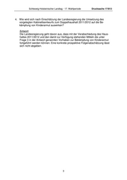 Schleswig-Holsteinischer Landtag - 17. Wahlperiode Drucksache 17/813 4. Wie wird sich nach Einschätzung der Landesregierung die Umsetzung des vorgelegten Kabinettsentwurfs zum Doppelhaushalt 2011/2012 auf die Be- kämpfung von Kinderarmut auswirken? Antwort: Die Landesregierung geht davon aus, dass mit der Verabschiedung des Haus- haltes 2011/2012 und den damit zur Verfügung stehenden Mitteln die unter Frage 3 in der Antwort genannten Vorhaben zur Bekämpfung von Kinderarmut fortgeführt werden können. Eine konkrete prospektive Folgenabschätzung lässt sich nicht abgeben. 3