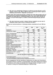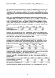Drucksache 15/1614 Schleswig-Holsteinischer Landtag - 15. Wahlperiode Die Gewerbeanzeigenstatistik nimmt eine Zuordnung der Betriebsgründungen zu den Wirtschaftszweigen nicht vor und veröffentlicht auch keine Beschäftigtenzahlen. Eine Verbesserung der Erhebungsgrundlagen im Rahmen einer Novellierung der Gewerbe- anzeigenstatistik wird zur Zeit von den Fachreferenten der Statistischen Landesämter erarbeitet. Einen Trend für die Ansiedlungsdynamik neuer Unternehmen in Schleswig-Holstein vermittelt die Zahl der durch Beratung und Förderung von der WSH und/oder den regi- onalen Wirtschaftsförderern, z.T. in Zusammenarbeit mit dem Ministerium für Wirt- schaft, Technologie und Verkehr des Landes Schleswig-Holstein sowie der Investiti- onsbank Schleswig-Holstein angesiedelten Unternehmen. In Anbetracht der weltwirt- schaftlichen Lage weisen diese betreuten Ansiedlungen eine erfreulich stabile Tendenz auf. 1998 1999 2000 2001 Unternehmen 146 158 137 145 geplante Arbeitsplätze 2.561 1.959 3.253 1.683 So konnte die Anzahl der im Jahr 2001 angesiedelten Unternehmen gegenüber dem Vorjahr leicht gesteigert werden, wobei etwa jeder zweite Fall eine Neugründung war. Die Zurückhaltung der angesiedelten Unternehmen bei der Planung neuer Arbeitsplät- ze im Jahr 2001 beruht auf der weltwirtschaftlichen Lage. Eine ebenfalls stabile Entwicklung zeigen die Handelsregisterbewegungen, die als aussagekräftiger Indikator der Gründungsaktivität gelten. Der Verband der Vereine Creditreform e.V. weist folgende Jahresergebnisse für die Unternehmensneueintra- gungen und Löschungen in den Handelsregistern in Schleswig-Holstein aus: 1998 1999 2000 2001 Eintragungen 4.208 4.083 4.401 4.422 Löschungen 1.519 1.654 1.651 1.643 Saldo 2.689 2.429 2.750 2.779 Der positive Saldo spricht für ein stabiles Gründungsgeschehen in Schleswig-Holstein. Im westdeutschen Vergleich des Nettoüberschusswertes je Einwohnerstärke rangiert Schleswig-Holstein seit Jahren in der Spitzengruppe der Länder. Die Deutsche Ausgleichsbank (DtA), die die zentralen Existenzgründungsprogramme abwickelt, registriert in Schleswig-Holstein für die Jahre 1998 bis 2001 folgende För- derkennzahlen: 1998 1999 2000 2001 Anzahl geförderter Personen 1.795 1.976 1.824 1.321 gesicherte Arbeitsplätze 9.222 9.619 8.757 7.636 neu geschaffene Arbeitplätze 2.194 2.728 2.820 1.940 Eine Unterteilung nach Sparten und Berufen liegt für die Länderergebnisse nicht vor. 2