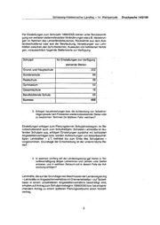 Drucksache 14/2199 __Schleswig-Holsteinischer Landtag -14. Wahlperiode Schulart Versetzungen Beendigung des summe in den Arbeitsverhalt- Ruhestand nisses bei Rentenbezug Grund- und Hauptschule ·- - -- 68 -.. 5 73 Sonderschule --· .. Hi 0,5 15,5 Realschule . -- . - 38 0,5 38,5 -- Gymriasiüm 38 6 44 - Berufsbildende Schule 32' 3 35 Gesamtschule - - ----3 . 0 3 Summe: - - -- -- '19.11 - -. 15 209 "-. ,. -- ,.-,,.-._~ .. ~- -- ".;,.-~- ~ - Inwieweit Stellen aufgrundvon Pensionierungen ab dem 1.08.1999 bis zum 31.12.1999 freiwerden, ist abhängig vom Abgangs-/Antragsverhal- ten der Lehrkräfte. 2. ln welchem Umfang werden dieses Stellen- aufgeschlüsselt nach Schularten- ggf. zur Aufstockung bisheriger Teilzeitverträge be- nötigt. und wie viele Stellen bleiben ggf. in den jeweiligen Schul- arten als "Einstellungskorridor'' für tatsächliche Neueinsteilungen verfügbar? Der voraussichtliche Stellenbedarf für Aufstockung von bisher teilzeitbe- schäftigten Angestellten zum 1.08.1999 ist der folgenden Übersicht zu entnehmen. Schulart Stellenbedarf tar AUfstockung von Teilzeitvertragen Grund- und Hauptschule ca.-n; Steßen Sonderschule c:a::rstellen Realschule ca.·rs stelren Gymnasium . - cä 8 stenerr Berufsbildende Schule ·---- - .. e:a:· 5 steiTer{ Gesamtschule ca:-iiYSteiren Summe: -ea. :>!I ::>teilen -- - .. ... -·· 2