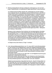 Schleswig-Holsteinischer Landtag - 15. Wahlperiode Drucksache 15/ 1778 3. Welches landespolitische Interesse verfolgt die Landesregierung, wenn sie Ham- burger Projektentwickler mit ausländischen Regierungsvertretern zusammenbringt? Im Vordergrund der Kontakte zwischen der Landesregierung und dem Sultanat Oman stand der Wunsch, die spätestens seit der Aufnahme Omans in die WTO im Oktober 2000 deutlich verbesserten Rahmenbedingungen für Auslandsinverstoren auch für schleswig-holsteinischische Unternehmen nutzbar zu machen. In diesem Sinne war mit Schreiben vom 18. Januar 2001 auch ein schleswig-holsteinischer Unternehmer mit der Bitte an die Ministerpräsidentin herangetreten, entsprechende Aktivitäten schleswig-holsteinischer Unternehmen zu unterstützen. Dabei hat die Landesregierung den Umstand, dass ein möglicher Kooperationspartner seinen Firmensitz in Hamburg hat, zu keinem Zeitpunkt als nachteilig bewertet. In Überein- stimmung mit den Regierungen der anderen norddeutschen Länder ist die Landes- regierung stets der Auffassung gewesen, dass Ländergrenzen keine Schranken für die vielfältigen Kooperationsmöglichkeiten, die im Interesse aller an dieser Zusam- menarbeit beteiligten Partner und Regionen liegen, darstellen dürfen. Dies wird auch durch das gemeinsame Regionale Entwicklungskonzept (REK) – Metropolre- gion Hamburg – dokumentiert. Bezogen auf den arabischen Raum befinden sich die diesbezüglichen Aktivitäten der Landesregierung auch in hoher Übereinstimmung mit den Bemühungen der Bundesregierung, die u. a. im Rahmen der Vereinbarungen der German-Saudi Joint Commission on Economic and Technical Cooperation im November 1999 doku- mentiert und in der Folgezeit wiederholt (u. a. beim Besuch des omanischen Au- ßenministers beim Bundeswirtschaftsminister Müller im Oktober 2001 sowie durch den Präsidenten der Deutsch-Arabischen Gesellschaft Möllemann im Oktober 2001 in Dubai) bekräftigt worden sind. Im Übrigen wird auf die Antwort zu Frage 1 verwiesen. 4. In der Jahresauftaktpressekonferenz vom 12. Januar 2001 hat die Ministerpräsiden- tin unter Hinweis auf ihre Mitgliedschaft im Beirat der Weltgesundheitsorganisation erklärt, im November 2001 werde im Rahmen eines großen Gesundheitskongresses das Interesse anderer Länder, nämlich Japans, Chinas, Saudi-Arabiens, Omans und der USA an einer Zusammenarbeit mit dem Gesundheitsland Schleswig-Holstein dokumentiert werden. Sie hat dies in ihrem Vortrag vom 22. März 2001 vor der Mitgliederversammlung der Gesellschaft für Betriebswirte wiederholt. Was hat dazu geführt, dass das Land Oman sein Interesse an einer Zusammenar- beit mit dem Land Schleswig-Holstein in Fragen der Gesundheitspolitik anlässlich des Gesundheitskongresses im November 2001 nicht mehr erläuterte? Zielsetzung des Kongresses „Gesundheit der Zukunft – Zukunft mit Gesundheit“ am 28. November 2001 war es laut Einladung, über die Entwicklung und die damit ver- bundenen Potenziale des Gesundheitsmarktes zu diskutieren sowie erste Ergeb- nisse der Gesundheitsinitiative vorzustellen und Anregungen für weitere Projekte zu sammeln. 3