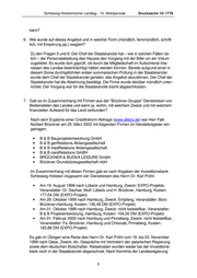 Schleswig-Holsteinischer Landtag - 15. Wahlperiode Drucksache 15/ 1778 kann? 6. Wie wurde auf dieses Angebot und in welcher Form (mündlich, fernmündlich, schrift- lich, mit Empörung pp.) reagiert? Zu den Fragen 5 und 6: Der Chef der Staatskanzlei hat – wie in solchen Fällen üb- lich – der Personalabteilung des Hauses den Vorgang mit der Bitte um ein Votum zugeleitet. Es wurde dort geprüft, ob durch die Mitgliedschaft im Aufsichtsrat Inte- ressen des Landes beeinträchtigt hätten werden können. Bereits aufgrund einer in diesem Sinne durchgeführten ersten summarischen Prüfung in der Staatskanzlei wurde dem Chef der Staatskanzlei geraten, das Angebot abzulehnen. Der Chef der Staatskanzlei hat die Ablehnung bestätigt. Die Firma wurde darüber mündlich unter- richtet. Der Vorgang war für die Staatskanzlei damit abgeschlossen. 7. Gab es im Zusammenhang mit Firmen aus der “Brückner-Gruppe” Dienstreisen von Bediensteten des Landes und wenn ja, wohin, mit welchem Zweck und mit welchem finanziellen Aufwand für das Land verbunden? Nach dem Ergebnis einer Creditreform-Abfrage (www.alleco.de) war Herr Falk Norbert Brückner am 25. März 2002 mit folgenden Firmen im Handelsregister ein- getragen: • B & B Bauprojektentwicklung GmbH • B & B gerRelations Aktiengesellschaft • B & B medRelations Aktiengesellschaft • B & B careRelations GmBH • BRÜCKNER & BUDKA LEISURE GmbH • Brückner Grundstücksgesellschaft mbH Im Zusammenhang mit diesen Firmen gab es nach Angaben der Investitionsbank Schleswig-Holstein insgesamt vier Dienstreisen des Herrn Dr. Karl Pröhl: • Am 19. August 1999 nach Lübeck und Hamburg, Zweck: EXPO-Projekte, Veranstalter: Dr. Sachse, MuK Lübeck und H. Brückner, Hamburg, Kosten: 177,04 DM (EXPO-Projekt) • Am 29. Oktober 1999 nach Hamburg, Zweck: Empfang, Veranstalter: Büro Brückner,Hamburg, Kosten: 136,48 DM (EXPO-Projekt) • Am 01. Oktober 1999 nach Hamburg, Zweck: nicht feststellbar, Veranstalter: B & B Projektentwicklung, Hamburg, Kosten: 104,00 DM (EXPO-Projekt) • Am 01. Februar 2000 nach Hamburg und Pinneberg, Zweck: nicht feststellbar, Veranstalter: Fa. Brückner, Hamburg und Chitocab, Pinneberg, Kosten: 182,88 DM (EXPO-Projekt) Es gab im Übrigen eine Reise des Herrn Dr. Karl Pröhl vom 19. bis 22. November 1999 nach Qatar, Zweck: div. Gespräche mit Vertretern der qatarischen Regierung sowie dem deutschen Botschafter. Reisekosten wurden weder bei der Investitions- bank noch in der Staatskanzlei abgerechnet. Nach Kenntnis der Landesregierung 5