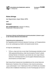 SCHLESWIG-HOLSTEINISCHER LANDTAG Drucksache 15/490 15. Wahlperiode 00-10-24 Kleine Anfrage des Abgeordneten Jürgen Weber (SPD) und Antwort der Landesregierung - Ministerin für Bildung, Wissenschaft, Forschung und Kultu r Forschung im Bereich der Behandlung der Autoimmunkrankheit „Schwerer Lupus“ an der Christian-Albrechts-Universität Kiel Vorbemerkung der Landesregierung: Die Fragestellung berührt kontrovers diskutierte Forschungs- und Therapieverfahren, die von der Landesregierung inhaltlich nicht bewertet werden können. Ich frage die Landesregierung: 1. Trifft es zu, dass durch die von einer Kieler Forschergruppe entwickelte und seit 1980 angewandte Behandlung („Kieler Synchronisations-Protokoll“) weltweit erstmalig Patienten mit Schwerem Lupus bereits über einen langen Zeitraum vollkommen krankheitssymptomfrei und ohne jegliche Weiterbehandlung bzw. ohne Einnahme von Kortison leben? Nach Auskunft des Vorstands des Universitätsklinikums Kiel und des Dekans der Medizinischen Fakultät der CAU sind Patienten mit der Autoimmunerkrankung „Lupus erythematodes“ in der II. Medizinischen Klinik und Poliklinik des Universitäts- klinikums Kiel im Städtischen Krankenhaus von einer Forschergruppe auf Grund e i-