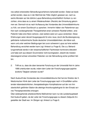 nes selbst entwickelten Behandlungsverfahrens behandelt worden. Dabei sei beob- achtet worden, dass es in der Mehrheit der Fälle möglich gewesen sei, nach ca. sechs Monaten auf die übliche Lupus-Behandlung einschließlich Kortison zu ver- zichten, ohne dass es zu einem Wiederauftreten (Rezidiv) der Erkrankung gekom- men sei. Dennoch ist es nach Auffassung des Vorstandes des Universitätsklinikums zu früh, von einem Durchbruch zu sprechen. Immerhin hätten vier Patientinnen aus Kiel nach vorübergehender Therapiefreiheit einen schweren Rückfall erlitten , eine Patientin habe eine Niere verloren, zwei weitere seien an Lupus verstorben. Diese Erfahrungen seien derzeit Ausgangspunkt für eine neue, durch die Bundesregierung geförderte multizentrische Studie deutscher Universitätskliniken, die klären soll, wann und unter welchen Bedingungen bei zuvor schwerem Lupus auf eine weitere Behandlung verzichtet werden kann (vgl. Antwort zu Frage 6). Die o.a. Behand- lungsmethode werde in den wissenschaftlichen Fachkreisen kontrovers diskutiert und habe sich aus diesem Grund bisher nicht durchgesetzt , obwohl die meisten überwiegend schwer erkrankten Patienten von der Behandlung sicher profitiert hät- ten. 2. Trifft es zu, dass die oben benannte Forschung an der Universität Kiel im Jahre 1999 unterbunden wurde, indem dem Leiter der Forschungsgruppe jegliche ärztliche Tätigkeit verboten wurde? Nach Auskunft des Vorstandes des Universitätsklinikums Kiel hat d er Direktor der II. Medizinischen Klinik dem Leiter der Forschungsgruppe nach in Einzelfällen auftre- tenden lebensbedrohlichen, therapiebedingten Komplikationen auf der von ihm oberärztlich geführten Station die alleinige Anordnungsbefugnis für den Einsatz se i- nes Therapieprotokolles entzogen. Über weitergehende arbeitsrechtliche Maßnahmen kann nur die Landeshauptstadt Kiel Auskunft geben, da der Leiter der Forschungsgruppe zu diesem Zeitpunkt An- gestellter der Stadt war. Im Übrigen vgl. Antwort zu Frage 6.