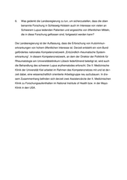 6. Was gedenkt die Landesregierung zu tun, um sicherzustellen, dass die oben benannte Forschung in Schleswig-Holstein auch im Interesse von vielen an Schwerem Lupus leidenden Patienten und angesichts von öffentlichen Mitteln, die in diese Forschung geflossen sind, fortgesetzt werden kann? Die Landesregierung ist der Auffassung, dass die Erforschung von A utoimmun- erkrankungen von hohem öffentlichen Interesse ist. Derzeit entsteht ein vom Bund gefördertes nationales Kompetenznetzwerk „Entzündlich-rheumatische System- erkrankung“. In diesem Kompetenznetzwerk, an dem der Direktor der Poliklinik für Rheumatologie am Universitätsklinikum Lübeck federführend beteiligt ist, wird auch die Behandlung des schweren Lupus erythematodes erforscht. Die II. Medizinische Klinik der Universität Kiel arbeitet im Rahmen des Kompetenznetzes mit und ist de r- zeit dabei, eine wissenschaftlich orientierte Arbeitsgruppe neu aufzubauen. In di e- sem Zusammenhang befinden sich derzeit zwei Assistenzärzte der II. Medizinischen Klinik zu Forschungsaufenthalten im National Institute of Health bzw. in der Mayo- Klinik in den USA.
