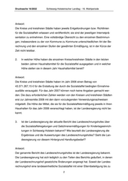 Drucksache 16/2032 Schleswig-Holsteinischer Landtag - 16. Wahlperiode Antwort: Die Kreise und kreisfreien Städte haben jeweils Entgeltordnungen bzw. Richtlinien für die Sozialstaffeln erlassen und veröffentlicht; sie sind der jeweiligen Internetprä- sentation zu entnehmen. Eine vollständige Übersicht zu den einzelnen Bestimmun- gen, insbesondere zu der von Kommune zu Kommune unterschiedlichen Art der Be- rechnung und den einzelnen Stufen der gewährten Ermäßigung, ist in der Kürze der Zeit nicht leistbar. 2. In welcher Höhe haben die einzelnen Kreise/kreisfreien Städte in den letzten beiden Jahren Haushaltsmittel für die Sozialstaffel ausgegeben und in welcher Höhe stellen sie in diesem Jahr Haushaltsmittel bereit? Antwort: Die Kreise und kreisfreien Städte haben im Jahr 2006 einen Betrag von 43.371.267,15 € für die Erstattung der durch die Sozialstaffel bedingten Einnahme- ausfälle verausgabt. Für das Jahr 2007 können noch keine Angaben gemacht wer- den. Die dazu erforderlichen Zahlen werden von den Kreisen und kreisfreien Städten erst zur Jahresmitte 2008 mit den dann vorzulegenden Verwendungsnachweisen mitgeteilt. Die Höhe der Mittel, die sie für die Sozialstaffelermäßigung jeweils in ihren Haushalten für das Jahr 2008 veranschlagt haben, ist der Landesregierung nicht be- kannt. 3. Ist der Landesregierung der aktuelle Bericht des Landesrechnungshofes über die Sozialstaffelregelungen und Gebührenermäßigungen für Kindertageeinrich- tungen in Schleswig-Holstein bekannt? Wie beurteilt die Landesregierung die Ergebnisse und die Auswertungen des Landesrechnungshofes? Sieht die Lan- desregierung vor diesem Hintergrund Handlungsbedarf? Antwort: Der genannte Bericht des Landesrechnungshofes ist der Landesregierung bekannt. Die Landesregierung hat sich lediglich zu den Teilen des Berichts geäußert, in denen der Landesrechnungshof gesetzliche Änderungen angeregt hat. Soweit der Landes- rechnungshof eine landeseinheitliche Sozialstaffel mit einer Elternbeteiligung bis zu 2