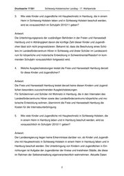 SCHLESWIG-HOLSTEINISCHER LANDTAG Drucksache 17/351 17. Wahlperiode 2010-03-16 Kleine Anfrage des Abgeordneten Detlef Buder und Antwort der Landesregierung - Minister für Bildung und Kultur Gastschüler und Gastheimkinder in Hamburg und Schleswig-Holstein 1. Wie viele Schülerinnen und Schüler welcher Schularten mit Wohnsitz in Schleswig-Holstein werden im Schuljahr 2010/11 öffentliche und private Schu- len in Hamburg besuchen, sofern die bestehenden Schulverhältnisse weiterhin Gültigkeit haben? 2. Wie viele Schülerinnen und Schüler der verschiedenen Schularten mit Wohnsitz in Hamburg werden im Schuljahr 2010/11 öffentliche und private Schulen in Schleswig-Holstein besuchen, sofern die bestehenden Schulverhältnisse wei- terhin Gültigkeit haben? Antwort zu Frage 1 und 2: Zu den jeweils aktuell verfügbaren Schülerzahlen wird auf Drucksache 17/319 ver- wiesen. Eine Prognose der Schülerzahlentwicklung im Schuljahr 2010/11 ist nicht möglich.