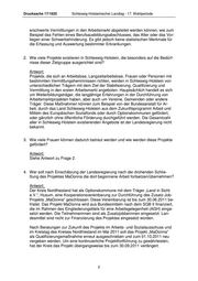 Drucksache 17/1625 Schleswig-Holsteinischer Landtag - 17. Wahlperiode erschwerte Vermittlungen in den Arbeitsmarkt abgeleitet werden können, wie zum Beispiel das Fehlen eines Berufsausbildungsabschlusses, das Alter oder das Vor- liegen einer Schwerbehinderung. Es gibt jedoch keine statistischen Merkmale für die Erfassung und Auswertung bestimmter Erkrankungen. 2. Wie viele Projekte existieren in Schleswig-Holstein, die besonders auf die Bedürf- nisse dieser Zielgruppe ausgerichtet sind? Antwort: Projekte, die sich an Arbeitslose, Langzeitarbeitslose, Frauen oder Personen mit bestimmten Vermittlungshemmnissen richten, werden in Schleswig-Holstein von unterschiedlichen Trägern mit dem Ziel der Stabilisierung, Qualifizierung und Vermittlung in den ersten Arbeitsmarkt angeboten. Hauptsächlich handelt es sich um Weiterbildungsträger, die langjährige Erfahrungen in der Durchführung von Arbeitsmarktprojekten haben, aber auch um Vereine, Gemeinden oder andere Träger. Diese Maßnahmen können zum Beispiel von der Bundesanstalt für Ar- beit, durch das Land Schleswig-Holstein aus dem Zukunftsprogramm Arbeit und Mitteln des Europäischen Sozialfonds oder durch Optionskommunen gefördert, oder gänzlich ohne öffentliche Förderung durchgeführt werden. Die Gesamtzahl aller in Schleswig-Holstein existierenden Angebote ist der Landesregierung nicht bekannt. 3. Wie viele Frauen können dadurch betreut werden und wie werden diese Projekte gefördert? Antwort: Siehe Antwort zu Frage 2. 4. Wer soll nach Einschätzung der Landesregierung nach der drohenden Schlie- ßung des Projektes MaDonna die dort begonnene Arbeit fortsetzen/übernehmen? Antwort: Der Kreis Nordfriesland hat als Optionskommune mit dem Träger „Land in Sicht e.V.“, Husum, eine Kooperationsvereinbarung zur Durchführung des Zusatz-Job- Projekts „MaDonna“ geschlossen. Diese Vereinbarung ist bis zum 30.06.2011 be- fristet. Das Projekt MaDonna wird aus Bundesmitteln nach dem SGB II finanziert, die im Rahmen des Eingliederungstitels für eine Arbeitsgelegenheit (AGH) einge- setzt werden. Die Teilnehmerinnen sind als Zusatzjobberinnen eingesetzt. Lan- desmittel sind nicht zur Finanzierung des Projektes eingesetzt worden. Nach Beratungen zur Zukunft des Projekts im Arbeits- und Sozialausschuss und im Kreistag des Kreises Nordfriesland im Mai 2011 soll das Projekt „MaDonna“ als Qualifizierungsmaßnahme erneut ausgeschrieben und zum 01.10.2011 neu vergeben werden. Um eine kontinuierliche Projektfortführung zu gewährleisten, hat der Kreis das Projekt übergangsweise bis zum 30.09.2011 verlängert. 2