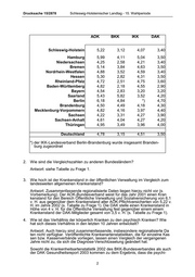 Drucksache 15/2878 Schleswig-Holsteinischer Landtag - 15. Wahlperiode AOK BKK IKK DAK Schleswig-Holstein 5,22 3,12 4,07 3,40 Hamburg 5,99 4,11 5,04 3,50 Niedersachsen 4,25 2,58 4,21 3,40 Bremen 5,14 3,84 4,63 3,50 Nordrhein-Westfalen 4,88 3,52 4,59 3,40 Hessen 5,30 2,82 4,31 3,50 Rheinland-Pfalz 4,72 2,51 4,75 3,60 Baden-Württemberg 4,82 2,18 4,55 2,90 Bayern 4,54 2,83 3,20 3,20 Saarland 5,43 5,82 3,52 4,20 Berlin 6,18 4,84 *) 4,70 Brandenburg 4,50 4,49 4,18 4,30 Mecklenburg-Vorpommern 4,82 4,16 3,97 4,40 Sachsen 4,22 3,31 4,27 3,90 Sachsen-Anhalt 4,61 4,04 4,27 4,20 Thüringen 4,95 3,49 3,96 4,00 Deutschland 4,78 3,15 4,51 3,50 *) der IKK-Landesverband Berlin-Brandenburg wurde insgesamt Branden- burg zugeordnet 2. Wie sind die Vergleichszahlen zu anderen Bundesländern? Antwort: siehe Tabelle zu Frage 1. 3. Wie hoch ist der Krankenstand in der öffentlichen Verwaltung im Vergleich zum landesweiten allgemeinen Krankenstand? Antwort: Zusammenfassende regionalisierte Daten liegen hierzu nicht vor (s. Vorbemerkung). Der AOK-Bundesverband weist für das Jahr 2001 einen Kran kenstand für den Bereich Öffentliche Verwaltung und Sozialversicherung von 6,1 v. H. aus gegenüber dem Krankenstand aller AOK-Pflichtversicherten von 5,22 v. H. im Jahre 2002 (s. Tabelle zu Frage 1). Die DAK stelle einen Krankenstand in Höhe von 4 v. H. für die Öffentliche Verwaltung fest gegenüber einem einem Krankenstand der DAK-Mitglieder gesamt von 3,5 v. H. (s. Tabelle zu Frage 1). 4. Wie ist das Verhältnis der körperlich Kranken zu den psychisch Kranken? Wie hat sich dieses Verhältnis in den letzten 10 Jahren entwickelt? Antwort: Auch hierzu sind zusammenfassende, insbesondere regionalisierte Da ten nicht verfügbar. Veröffentlichte Krankenartenstatistiken, die für einzelne Kas sen bzw. Kassenverbände vorliegen, lassen einen Vergleich der vergangenen Jahre nicht zu, da sich die Diagnose-Verschlüsselung geändert hat. Sowohl die Krankenheitsartenstatistik 2002 des BKK-Bundesverbandes als auch der DAK Gesundheitsreport 2003 kommen zu dem Ergebnis, dass die psychi- 2
