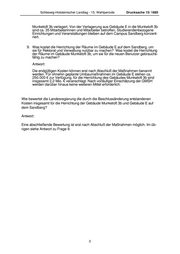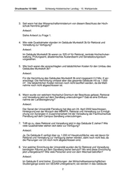 Drucksache 15/1885 Schleswig-Holsteinischer Landtag - 15. Wahlperiode 3. Seit wann hat das Wissenschaftsministerium von diesem Beschluss der Hoch- schule Kenntnis gehabt? Antwort: Siehe Antwort zu Frage 1. 4. Wie viele Quadratmeter standen im Gebäude Munketoft 3b für Rektorat und Verwaltung zur Verfügung? Antwort: Im Gebäude Munketoft 3b waren ca. 525 m² für Rektorat, zentrale Hochschulver- waltung, Prüfungsamt, akademisches Auslandsamt und Senatssitzungsraum vorgesehen. 5. Wie hoch waren die veranschlagten und tatsächlichen Kosten für den Umbau des Gebäudes Munketoft 3b? Antwort: Für die Herrichtung des Gebäudes Munketoft 3b sind insgesamt 2,2 Mio. € ver- anschlagt. Die Herrichtung umfasst aber das gesamte Gebäude mit ca. 1.830 m². Die tatsächlichen Kosten können noch nicht beziffert werden, da die Maß- nahme noch nicht abgeschlossen ist. 6. Wann wurde von welchem Hochschul-Gremium der Beschluss gefasst, Rektorat und Verwaltung jetzt auf dem Sandberg unterzubringen? Gab es eine Einfluss- nahme der Landesregierung? Antwort: Der Senat der Universität Flensburg hat dies am 24. April 2002 beschlossen. Hintergrund war der Wunsch des MBWFK, Rektorat und Verwaltung zur Ermögli- chung von Synergien in Zusammenarbeit mit der Verwaltung der Fachhochschule Flensburg auf dem Campus Sandberg unterzubringen. 7. Trifft es zu, dass Rektorat und Verwaltung jetzt in das Gebäude E ziehen? Wie viele Quadratmeter stehen dort dafür zur Verfügung? Antwort: Ja. Da Gebäude E verfügt über ca. 1.200 m² Hauptnutzfläche; wie viel davon für Rektorat und Verwaltung zur Verfügung stehen werden, steht noch nicht fest, da die Planungen vor Ort noch nicht abgeschlossen sind. 8. Von welcher Einrichtung der Universität wurden die für Rektorat und Verwaltung benötigten Räume auf dem Sandberg bisher benutzt? Wo wird diese Einrichtung jetzt untergebracht? Wie viele Personen sind von dem Wechsel betroffen? Antwort: Im Gebäude E sind bisher Einrichtungen der Wirtschaftswissenschaftlichen Studiengänge sowie von SESAM untergebracht; sie werden in das Gebäude 2