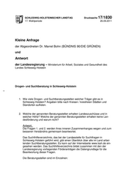 SCHLESWIG-HOLSTEINISCHER LANDTAG Drucksache 17/1830 17. Wahlperiode 26.09.2011 Kleine Anfrage der Abgeordneten Dr. Marret Bohn (BÜNDNIS 90/DIE GRÜNEN) und Antwort der Landesregierung – Ministerium für Arbeit, Soziales und Gesundheit des Landes Schleswig-Holstein Drogen- und Suchtberatung in Schleswig-Holstein 1. Wie viele Drogen- und Suchtberatungsstellen welcher Träger gibt es in Schleswig-Holstein? Angaben bitte nach Kreisen / kreisfreien Städten und Standorten auflisten. 2. Welche der genannten Beratungsstellen erhalten Landeszuschüsse und in welcher Höhe? Welche der genannten Beratungsstellen erhalten keine Lan- desförderung und warum nicht? Antwort: Die Fragen 1. und 2. werden ihres inneren Zusammenhanges wegen und zum besseren Verständnis gemeinsam beantwortet. Das Suchthilfeverzeichnis, das bei der Landesstelle für Suchtfragen in Schleswig-Holstein geführt wird, gibt einen Überblick über alle im Land arbei- tenden Suchtberatungsstellen. Es kann auf der Internetseite www.lssh.de ein- gesehen werden. Das Suchthilfeverzeichnis bildet zusammen mit den der Landesregierung vorliegenden Förderanträgen die Datengrundlage für die Beantwortung dieser Fragen. Die Beratungsstellen sind im Einzelnen: