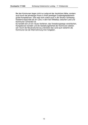 Drucksache 17/1830 Schleswig-Holsteinischer Landtag - 17. Wahlperiode Bei den Kommunen liegen nicht nur aufgrund der räumlichen Nähe, sondern auch durch die jahrelange Praxis in ihrem jeweiligen Zuständigkeitsbereich große Kompetenzen. Dies liegt nicht zuletzt auch in der Struktur Schleswig- Holsteins begründet als ein Land, in dem kein Mittelbau zwischen Land und Kommunen vorhanden ist. Es handelt sich um ein neues Verfahren, das Verwaltungswege vereinfachen, Kompetenzen bündeln und die Gestaltungsfreiheit der Kommunen stärken soll. Durch die Neustrukturierung unterstützt das Land auch weiterhin die Kommunen bei der Wahrnehmung ihrer Aufgaben. 10