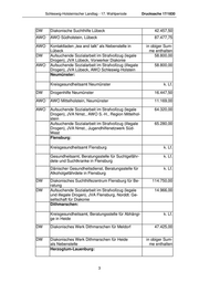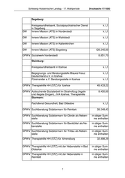 Schleswig-Holsteinischer Landtag - 17. Wahlperiode Drucksache 17/1830 Segeberg: Kreisgesundheitsamt, Sozialpsychiatrischer Dienst k. Lf. in Segeberg DW Innere Mission (ATS) in Norderstedt k. Lf. DW Innere Mission (ATS) in Wahlstedt k. Lf. DW Innere Mission (ATS) in Kaltenkirchen k. Lf. DW Innere Mission (ATS) Segeberg 120.245,00 DPWV Sozialwerk Norderstedt 8.851,70 Steinburg: Kreisgesundheitsamt in Itzehoe k. Lf. Begegnungs- und Beratungsstelle Blaues Kreuz k. Lf. Deutschland e.V. in Itzehoe Füreinander e.V. Beratungsstelle in Itzehoe k. Lf. DPWV Therapiehilfe HH (STZ) für Itzehoe 45.433,22 DPWV Aufsuchende Sozialarbeit im Strafvollzug (legale 8.400,00 und illegale Drogen), JVA Itzehoe, Therapiehilfe Stormarn: Fachdienst Gesundheit, Bad Oldesloe k. Lf. DPWV Suchtberatung Südstormarn für Reinbek 26.248,43 DPWV Suchtberatung Südstormarn für Glinde als Neben- in obiger Sum- stelle me enthalten DPWV Suchtberatung Südstormarn für Barsbüttel als Ne- in obiger Sum- benstelle me enthalten DPWV Suchtberatung Südstormarn für Trittau als Neben- in obiger Sum- stelle me enthalten DPWV Therapiehilfe HH (STZ) für Ahrensburg 32.898,29 DPWV Therapiehilfe HH (STZ) mit der Nebenstelle in Bad in obiger Sum- Oldesloe me enthalten DPWV Therapiehilfe HH (STZ) mit der Nebenstelle in in obiger Sum- Reinfeld me enthalten 7