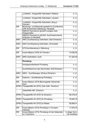 Schleswig-Holsteinischer Landtag - 17. Wahlperiode Drucksache 17/1830 „Lichtblick“, Drogenhilfe Ostholstein, Ratekau k. Lf. „Lichtblick“, Drogenhilfe Ostholstein, Lensahn k. Lf. „Lichtblick“, Drogenhilfe Ostholstein, Burg a. k. Lf. Fehmarn DW Beratungs- und Behandlungsstelle für Suchtkranke k. Lf. (DW Kirchenkreis Oldenburg), Neustadt AMEOS Psychatrium gGmbH Langbau Süd, k. Lf. Heiligenhafen AMEOS Psychatrium gGmbH, Suchtmedizinische k. Lf. Ambulanz in Neustadt AWO AWO Suchtberatung Ostholstein, Bad Schwartau k. Lf. AWO AWO Suchtberatung Ostholstein, Ahrensbök k. Lf. DW ATS-Suchtberatung in Oldenburg k. Lf. DW Innere Mission (ATS) für Fehmarn 14.535,00 AWO AWO Südholstein, Eutin 21.420,00 Pinneberg: Kreisgesundheitsamt Pinneberg k. Lf. Suchthilfezentrum des Ahornhofes, SHZ Elmshorn k. Lf. AWO AWO – Suchttherapie, Klinikum Elmshorn k. Lf. DW Diakonie – Suchtberatung Pinneberg k. Lf. DW Innere Mission (ATS) Bönningstedt, Gemeinde- k. Lf. haus DPWV Therapiehilfe HH (STZ) „Das Cafe“, Elmshorn k. Lf. „Selbsthilfe hilft“, Elmshorn k. Lf. DPWV Therapiehilfe HH (STZ) für Elmshorn 28.479,37 DPWV Therapiehilfe HH (STZ) für Pinneberg 19.503,73 DPWV Therapiehilfe HH (STZ) für Wedel 39.958,41 DW Innere Mission (ATS) Pinneberg in Tornesch- 11.878,75 Uetersen DW Innere Mission (ATS) Pinneberg mit der Nebenstel- in obiger Sum- le in Quickborn me enthalten 5
