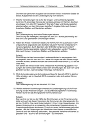Schleswig-Holsteinischer Landtag - 17. Wahlperiode Drucksache 17/1830 Die Höhe der jährlichen Ausgaben der einzelnen Kreise / kreisfreien Städte für dieses Aufgabenfeld ist der Landesregierung nicht bekannt. 7. Welche Veränderungen hat es für die Drogen- und Suchtberatungsstelle durch die 15-prozentige Kürzung der Landeszuschüsse im Rahmen des Sozi- alvertrages II im Jahr 2011 gegeben? Sind alle Träger und Beratungsstellen gleichermaßen von den Kürzungen betroffen? Angaben bitte nach Kreisen / kreisfreien Städten und Standorten auflisten. Antwort: Der Landesregierung sind keine Änderungen bekannt. Die Kürzung der freiwilligen Leistungen im Jahr 2011 wurde gleichmäßig auf alle vom Land geförderten Einrichtungen verteilt. 8. Haben die Kreise / kreisfreien Städte und Kommunen ihre Zuschüsse in 2011 entsprechend aufgestockt oder ebenfalls reduziert? Konnten entstandene Fi- nanzierungslücken durch Spenden oder Drittmittel kompensiert werden? Mussten Beratungsangebote reduziert oder aufgegeben werden? Angaben bitte nach Kreisen / kreisfreien Städten und Standorten auflisten. Antwort: Eine Abfrage bei den kommunalen Landesverbänden im vergangenen Jahr hat ergeben, dass für das Jahr 2011 keine Kürzungen bei den Städten vorge- nommen wurden; teilweise wurden die kommunalen Mittel erhöht (z. B. bei der Stadt Kiel). Von Seiten der Kreise wurde keine umfassende Rückmeldung gegeben. Kür- zungen der kommunalen Mittel sind bei den Einrichtungen, die auch vom Land gefördert werden, nach derzeitiger Aktenlage nicht bekannt. 9. Wird die Landesregierung die Landeszuschüsse für das Jahr 2012 in gleicher Höhe erhalten, wie im Haushalt 2012 vorgesehen oder sind weitere Kürzun- gen geplant? Antwort: Die Landesregierung hält am Haushalt 2012 fest. 10. Welche weiteren Auswirkungen erwartet die Landesregierung auf die Finan- zierung und die Arbeit der Drogen- und Suchtberatungsstellen in Schleswig- Holstein durch die ab 2012 geplante Kommunalisierung? Antwort: Das Land ist nur bei ca. der Hälfte der Einrichtungen an der Finanzierung be- teiligt und auch bei diesen finanzieren die Kommunen den überwiegenden An- teil (ca. 55-65%). Das Land fördert lediglich 1/3 bis 1/4 der Gesamtkosten. Vor diesem Hintergrund ist es notwendig, die vorhandenen Doppelstrukturen im Zuwendungsverfahren abzubauen. Es soll ein neuer Verfahrensweg gefunden werden, der die Förderungen der öffentlichen Hand besser zusammenführt. Damit ist auch die Hoffnung verbunden, das gesamte Verfahren effizienter zu gestalten und – auch für die Einrichtungen – zu erleichtern. 9