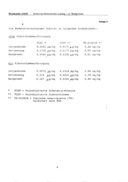 Drucksache 12/625 Schleswig-Holsteinischer Landtag- 12. Wahlperiode Anlage 4 • "Am Eichholz" in Uetersen wurden folgende Swmen der toxischen Äquivalente ( 'IE) enrti ttelt: Bodenprobe 1 2, 5 ng/kg ("nicht" belasteter Boden) Bodenprobe 2 224,3 ng/kg (Boden im Bereich früherer Kaolinklärschlammausbringung) Bodenprobe 3 7, 5 ng/kg ( "wenig" belasteter Boden) Bodenprobe 4 1, 7 ng/kg ("nicht" belasteter Boden) Bodenprobe 5 0,97 ng/kg ("nicht" belasteter Boden) Bodenprobe 6 62 , 0 ng /kg (Boden im Bereich früherer Kaolinklärschlammausbringung) Bodenprobe 7 2,8 ng/kg ("nicht" belasteter Boden) Bodenprobe 8 0,88 ng/kg ("nicht" belasteter Boden) Bodenprobe 9 2,6 ng/kg ("nicht" belasteter Boden) Bodenprobe 10 117,7 ng/kg (Boden im Bereich früherer Kaolinklärschlammausbringung) Bodenprobe 11 10, 9 ng/kg ( "wenig" belasteter Boden) Bodenprobe 12 0,48 ng/kg ("nicht" belasteter Boden) Bodenprobe 13 6.456,9 ng/kg (Kaolin-Klärschlarrm-Aggregat) Bodenprobe 14 813,0 ng/kg (Kaolin-Klärschlarrm-Aggregat) Bodenprobe 15 3, 6 ng/kg ( "nicht" belasteter Boden) Rammkernsondierung 1 3,1 ng/kg ("nicht" belasteter Boden) Rammkernsondierung 2 0,76 ng/kg ("nicht" belasteter Boden) Rammkernsondierung 4 1.479,7 ng/kg (Kaolin-Klärschlarrm-Aggregat) Rammkernsondierung 6 1,1 ng/kg ("nicht" belasteter Boden) 8