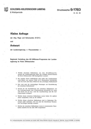 SCHLESWIG"HOLSTEINISCHER LANDTAG Drucksache 9/1783 9. Wahlperiode 10. 02. 83 Kleine Anfrage der Abg. Ruge und Schumacher (F.D.P.) und Antwort der Landesregierung - Finanzminister - Regionale Verteilung des 421 -Millionen-Programms der Landes- regierung im Kreis Dithmarschen 1. Welche einzelnen Maßnahmen aus dem 421-Millionen-Pro- gramm der Landesregierung sollen mit welchem Finanzvolumen im Kreis Dithmarschen 1983 durd1gefi.ihrt werden? 2. Bei welchen dieser Maßnahmen sind außer den Landesmitteln noch. Mittel von anderer Seite (z. B. Kommunen) erforderlich, und wie hoch sind diese Mittel bei den jeweiligen Maßnahmen? 3. Wie weit sind die notwendigen Planungen zur Durchführung der einzelnen Maßnahmen? 4. Soweit für die Durchführung der einzelnen Maßnahmen vor der Auftragsvergabe eine Aussd1reibun9" erforderlich ist, wann und durch wen ist bzw. wird die Aussdueibung und die Auf- tragsvergabe erfolgen? 5. Welche dieser einzelnen Maßnahmen waren bisher für spätere Jahre vorgesehen, wenn ja, für weld1e? 6. Welche dieser einzelnen Maßnahmen sind in bisherigen Pla~ nungen nicht enthalten, und wie sind die betroffenen KonimU· nen und Bürger beteiligt worden? 7. Welche der einzelnen Maßnahmen waren in kommunalen Haus· halten o~nehin für das Jahr 1983 vorgesehen? - - - - - ·--~------ Die Landtagsdrucksachen sind fortlaufend und einzeln beim Verlag Schmldt & Klaunig, Ringstraße 19, 2300 Kiel, Fernruf 6 20 95/96, zu beziehen.