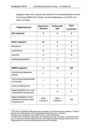 Drucksache 19/3112 Schleswig-Holsteinischer Landtag - 19. Wahlperiode Insgesamt haben sich im genannten Zeitraum 516 Landesbedienstete mit dem Coronavirus SARS-CoV-2 infiziert und sind infolgedessen an COVID-19 er- krankt. Im Detail: Beamtinnen Tarifbeschäf- Nicht Tätigkeitsbereich / Beamten tigte zuordenbar StK insgesamt 0 0 0 MJEV insgesamt 26 8 9 Ministerium 1 0 0 Justizvollzug 15 1 0 Gerichte 1 8 7 8 Staatsanwaltschaften 2 2 0 1 MBWK insgesamt 3 15 325 Fachrichtung Allgemeine 0 1 0 Dienste Fachrichtung Wissenschaftli- 1 0 0 che Dienste Lehre an Hochschulen 1 0 0 Wissenschaftliche bzw. tech- 1 14 0 nische MA an Hochschulen Allgemeinbildende und be- Siehe Siehe rufsbildende Schulen sowie 325 3 Fußnote 3 Fußnote 3 Förderzentren 1 Die 8 nicht zuordenbaren Fälle setzen sich zusammen aus 4 Richterinnen bzw. Richtern, 2 Referen- darinnen bzw. Referendaren und 2 Rechtspflege-Anwärterinnen bzw. –Anwärtern. 2 Bei dem nicht zuordenbaren Fall handelt es sich um einen Referendar. 3 Die 325 nicht zuordenbaren Fälle setzen sich zusammen aus 188 Lehrkräften, 26 Schulassistenzen und 111 weiteren an Schulen tätige Personen. Hier erfolgt wie bereits eingangs erwähnt keine nach Tätigkeitsbereich differenzierende Meldung seitens der Dienststellen.