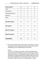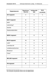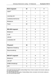 Drucksache 19/3112 Schleswig-Holsteinischer Landtag - 19. Wahlperiode Beamtinnen Tarifbeschäf- Nicht Tätigkeitsbereich / Beamten tigte zuordenbar StK insgesamt 0 0 0 MJEV insgesamt 9 0 0 MJEV 0 0 0 Justizvollzug 6 9 0 0 Gerichte 0 0 0 Staatsanwaltschaften 0 0 0 MBWK insgesamt 0 0 0 MILIG insgesamt 12 0 0 LaZuF 0 0 0 LVermGeo SH 0 0 0 Landesfeuerwehrschule 0 0 0 Ministerium 0 0 0 Polizei 7 12 0 0 MELUND insgesamt 0 0 0 FM insgesamt 0 0 0 6 Die Prüfung der hier genannten Fälle ist noch nicht abgeschlossen. 7 Die Prüfung der hier genannten Fälle ist noch nicht abgeschlossen.