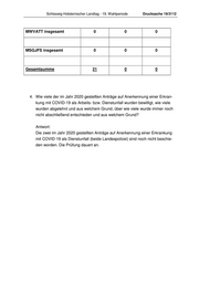 Schleswig-Holsteinischer Landtag - 19. Wahlperiode Drucksache 19/3112 MWVATT insgesamt 0 0 0 MSGJFS insgesamt 0 0 0 Gesamtsumme 21 0 0 4. Wie viele der im Jahr 2020 gestellten Anträge auf Anerkennung einer Erkran- kung mit COVID-19 als Arbeits- bzw. Dienstunfall wurden bewilligt, wie viele wurden abgelehnt und aus welchem Grund, über wie viele wurde immer noch nicht abschließend entschieden und aus welchem Grund? Antwort: Die zwei im Jahr 2020 gestellten Anträge auf Anerkennung einer Erkrankung mit COVID-19 als Dienstunfall (beide Landespolizei) sind noch nicht beschie- den worden. Die Prüfung dauert an.