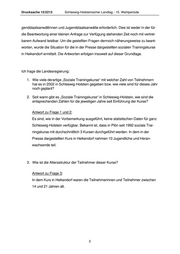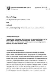 Drucksache 15/2212 Schleswig-Holsteinischer Landtag - 15. Wahlperiode gendstaatsanwältinnen und Jugendstaatsanwälte erforderlich. Dies ist weder in der für die Beantwortung einer kleinen Anfrage zur Verfügung stehenden Zeit noch mit vertret- barem Aufwand leistbar. Um die gestellten Fragen dennoch näherungsweise zu beant- worten, wurde die Situation für die in der Presse dargestellten sozialen Trainingskurse in Heikendorf ermittelt. Die Antworten erfolgen insoweit auf dieser Grundlage. Ich frage die Landesregierung: 1. Wie viele derartige „Soziale Trainingskurse“ mit welcher Zahl von Teilnehmern hat es in 2002 in Schleswig-Holstein gegeben bzw. wie viele sind für dieses Jahr noch geplant? 2. Seit wann gibt es „Soziale Trainingskurse“ in Schleswig-Holstein, wie sind die entsprechenden Zahlen für die jeweiligen Jahre seit Einführung der Kurse? Antwort zu Frage 1 und 2: Es sind, wie in der Vorbemerkung ausgeführt, keine statistischen Daten für ganz Schleswig-Holstein verfügbar. Bekannt ist, dass in Plön seit 1992 soziale Trai- ningskurse mit durchschnittlich 3 Kursen durchgeführt werden. In dem in der Presse dargestellten Kurs in Heikendorf nahmen 10 Jugendliche und Heran- wachsende teil. 3. Wie ist die Altersstruktur der Teilnehmer dieser Kurse? Antwort zu Frage 3: In dem Kurs in Heikendorf waren die Teilnehmerinnen und Teilnehmer zwischen 14 und 21 Jahren alt. 2