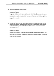 Schleswig-Holsteinischer Landtag - 15. Wahlperiode Drucksache 15/ 2212 4. Wer trägt die Kosten dieser Kurse? Antwort zu Frage 4: Träger der Maßnahme in Heikendorf war der Kreis Plön. Dort entstanden keine Zusatzkosten, da die Arbeitszeit der Betreuer im Rahmen der Gleitzeitregelung ausgeglichen wurde. 5. Werden die Teilnehmer der Kurse nach Absolvierung hinsichtlich ihres Verhal- tens zu den Delikten, derentwegen sie die Kurse zu absolvieren hatten, weiter beobachtet? Wenn ja: In welcher Form und mit welchen Ergebnissen? Wenn nein: Warum nicht? Antwort zu Frage 5: Wird der Kurs besucht, findet das gerichtliche bzw. staatsanwaltschaftliche Ver- fahren seinen Abschluss. Eine weitere persönliche Beobachtung der Teilnehmer findet deshalb nicht statt. 3