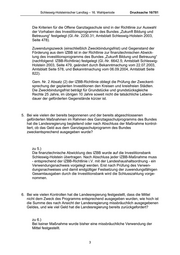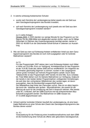 Schleswig-Holsteinischer Landtag – 16. Wahlperiode Drucksache 16/781 Die Kriterien für die Offene Ganztagsschule sind in der Richtlinie zur Auswahl der Vorhaben des Investitionsprogramms des Bundes „Zukunft Bildung und Betreuung“ festgelegt (Gl.-Nr. 2230.31; Amtsblatt Schleswig-Holstein 2003, Seite 478). Zuwendungszweck (einschließlich Zweckbindungsfrist) und Gegenstand der Förderung aus dem IZBB ist in der Richtlinie zur finanztechnischen Abwick- lung des Investitionsprogramms des Bundes „Zukunft Bildung und Betreuung“ (nachfolgend: IZBB-Richtlinie) festgelegt (Gl.-Nr. 6642.5; Amtsblatt Schleswig- Holstein 2003, Seite 479, geändert durch Bekanntmachung vom 22.07.2003, Amtsblatt Seite 578, und Bekanntmachung vom 06.09.2004, Amtsblatt Seite 822). Gem. Nr. 2 Absatz (2) der IZBB-Richtlinie obliegt die Prüfung der Zweckent- sprechung der geplanten Investitionen den Kreisen und kreisfreien Städten. Die Zweckbindungsfrist beträgt für Grundstücke und grundstücksgleiche Rechte 25 Jahre, im übrigen 10 Jahre soweit nicht die tatsächliche Lebens- dauer der geförderten Gegenstände kürzer ist. 5. Bei wie vielen der bereits begonnenen und der bereits abgeschlossenen geförderten Maßnahmen im Rahmen des Ganztagsschulprogramms des Bundes hat die Landesregierung begleitend oder nach Abschluss der Maßnahme kontrol- liert, ob das Geld aus dem Ganztagsschulprogramm des Bundes zweckentsprechend ausgegeben wurde? zu 5.) Die finanztechnische Abwicklung des IZBB wurde auf die Investitionsbank Schleswig-Holstein übertragen. Nach Abschluss jeder IZBB-Maßnahme muss - entsprechend der IZBB-Richtlinie i.V. mit der Landeshaushaltsordnung - ein Verwendungsnachweis vorgelegt werden. Erst nach Prüfung des Verwen- dungsnachweises und damit endgültiger Festsetzung der zuwendungsfähigen Gesamtausgaben durch die Investitionsbank wird die Schlusszahlung vorge- nommen. 6. Bei wie vielen Kontrollen hat die Landesregierung festgestellt, dass die Mittel nicht dem Zweck des Programms entsprechend ausgegeben wurden, wie hoch ist die Summe des nach Ansicht der Landesregierung missbräuchlich ausgegebenen Geldes, und wie viel Geld hat die Landesregierung bereits zurückgefordert? zu 6.) Bei keiner Maßnahme wurde bisher eine missbräuchliche Verwendung der Mittel festgestellt. 3