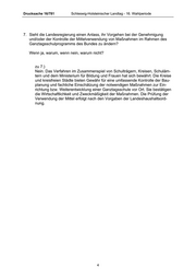 Drucksache 16/781 Schleswig-Holsteinischer Landtag - 16. Wahlperiode 7. Sieht die Landesregierung einen Anlass, ihr Vorgehen bei der Genehmigung und/oder der Kontrolle der Mittelverwendung von Maßnahmen im Rahmen des Ganztagsschulprogramms des Bundes zu ändern? Wenn ja, warum, wenn nein, warum nicht? zu 7.) Nein. Das Verfahren im Zusammenspiel von Schulträgern, Kreisen, Schuläm- tern und dem Ministerium für Bildung und Frauen hat sich bewährt. Die Kreise und kreisfreien Städte bieten Gewähr für eine umfassende Kontrolle der Bau- planung und fachliche Einschätzung der notwendigen Maßnahmen zur Ein- richtung bzw. Weiterentwicklung einer Ganztagsschule vor Ort. Sie bestätigen die Wirtschaftlichkeit und Zweckmäßigkeit der Maßnahmen. Die Prüfung der Verwendung der Mittel erfolgt nach den Vorgaben der Landeshaushaltsord- nung. 4