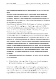 SCHLESWIG-HOLSTEINISCHER LANDTAG Drucksache 15/590 15. Wahlperiode 07. Dezember 2000 Kleine Anfrage der Abgeordneten Anke Spoorendonk (SSW) und Antwort der Landesregierung - Ministerin für Bildung, Wissenschaft, Forschung und Kultur § 15 Landesarchivgesetz - Kommunale Archive Vorbemerkung der Fragestellerin: Durch einen Beschluss im Haushaltsbegleitgesetz des Landes vom 08.02.1994 wurde die Kommunalklausel des Landesarchivgesetzes (§ 15) für fünf Jahre bis zum 01. Januar 2000 außer Kraft gesetzt. Ich frage die Landesregierung: 1. Was hat die Landesregierung unternommen, um die Kommunen auf die verä n- derte Situation nach dem 01. Januar 2000 vorzubereiten? Am 11.08.1992 wurde das Landesarchivgesetz (LArchG) verabschiedet. Der § 18 LArchG legte fest, dass die sog. „Kommunalklausel“ erst zum 01.01.1995 Geltung erlangen sollte. Dieser Zeitraum sollte den Kommunen die Möglichkeit eröffnen, a n- gemessene Voraussetzungen für eine gesetzeskonforme Archivierung ihres Schrif t- gutes zu schaffen.
