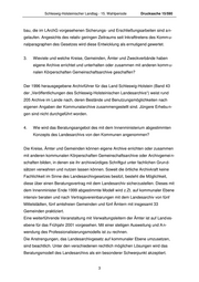 Schleswig-Holsteinischer Landtag - 15. Wahlperiode Drucksache 15/590 bau, die im LArchG vorgesehenen Sicherungs- und Erschließungsarbeiten sind a n- gelaufen. Angesichts des relativ geringen Zeitraums seit Inkrafttretens des Komm u- nalparagraphen des Gesetzes wird diese Entwicklung als ermutigend gewertet. 3. Wieviele und welche Kreise, Gemeinden, Ämter und Zweckverbände haben eigene Archive errichtet und unterhalten oder zusammen mit anderen komm u- nalen Körperschaften Gemeinschaftsarchive geschaffen? Der 1996 herausgegebene Archivführer für das Land Schleswig-Holstein (Band 43 der „Veröffentlichungen des Schleswig-Holsteinischen Landesarchivs“) weist rund 205 Archive im Lande nach, deren Bestände und Benutzungsmöglichkeiten nach eigenen Angaben der Kommunalarchive zusammengestellt sind. Jüngere Erhebu n- gen sind nicht durchgeführt worden. 4. Wie wird das Beratungsangebot des mit dem Innenministerium abgestimmten Konzepts des Landesarchivs von den Kommunen angenommen? Die Kreise, Ämter und Gemeinden können eigene Archive errichten oder zusammen mit anderen kommunalen Körperschaften Gemeinschaftsarchive oder Archivgemei n- schaften bilden, in denen sie ihr archivwürdiges Schriftgut unter fachlichen Grun d- sätzen verwahren und nutzen lassen können. Soweit die örtliche Archivkraft keine Fachlichkeit im Sinne des Landesarchivgesetzes besitzt, besteht die Möglichkeit, diese über einen Beratungsvertrag mit dem Landesarchiv sicherzustellen. Dieses mit dem Innenminister Ende 1999 abgestimmte Modell wird z.Zt. auf kommunaler Ebene intensiv beraten und nach Vertragsvereinbarungen mit dem Landesarchiv von fünf Mittelstädten, fünf amtsfreien Gemeinden und fünf Ämtern mit insgesamt 33 Gemeinden praktiziert. Eine weiterführende Veranstaltung mit Verwaltungsleitern der Ämter ist auf Land es- ebene für das Frühjahr 2001 vorgesehen. Mit einer stetigen Ausweitung und A n- wendung des Professionalisierungsmodells ist zu rechnen. Die Anstrengungen, das Landesarchivgesetz auf kommunaler Ebene umzusetzen, sind beachtlich. Unter den verschiedenen rechtlich möglichen Lösungen wird das Beratungsmodell des Landesarchivs als ein besonderer Schwerpunkt akzeptiert. 3