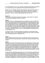 Drucksache 16/2672 Schleswig-Holsteinischer Landtag - 16. Wahlperiode Krankenhausbehandlungen in Schleswig-Holstein mit der Diagnose F 10.0 „Akute Alkoholintoxikation“ Kinder und Jugendliche zwischen 10 und 20 Jahren Geschlecht Geschlecht Summe Geschlecht Geschlecht Summe Gesamt Jahr männlich männlich männ- weiblich weiblich weib- summe 10-15 Jahre 15-20 Jahre lich 10-15 Jahre 15-20 Jahre lich 2000 46 134 180 37 105 142 322 2001 46 168 214 41 127 168 382 2002 53 242 295 48 165 213 508 2003 47 255 302 48 161 209 511 2004 67 322 389 57 185 242 631 2005 51 340 391 39 209 248 639 2006 38 319 357 44 157 201 558 2007 48 409 457 50 235 285 742 Quelle: Krankenhausstatistik „Diagnosedaten der Patienten und Patientinnen in Kranken- häusern“, Statistisches Bundesamt Frage 2 a) Erkennt die Landesregierung einen veränderten Alkohol- oder Drogenmissbrauch bei Kindern und Jugendlichen in Schleswig-Holstein? Wenn ja, welchen? Antwort: Alkohol ist die unter Kindern und Jugendlichen am weitesten verbreitete psychoakti- ve Substanz. Nach der Drogenaffinitätsstudie der Bundeszentrale für gesundheitliche Aufklärung aus dem Jahr 2008 haben rund dreiviertel (75,8 %) der 12- bis 17- Jährigen schon einmal Alkohol getrunken. Im zeitlichen Trend wird deutlich, dass der Anteil der Jugendlichen in dieser Altersgruppe, die im vergangenen Jahr mindestens wöchentlich irgendein alkoholisches Getränk getrunken haben, von 21,2 % im Jahr 2004 auf 17,4 % im Jahr 2008 zurückgegangen ist. Dieser Rückgang ist sowohl bei männlichen als auch bei weiblichen Jugendlichen zu beobachten, gleichwohl trinken deutlich mehr männliche Jugendliche regelmäßig Alkohol als weibliche. Andererseits ist der Anteil der 12- bis 17-Jährigen, die in den letzten 30 Tagen min- destens einmal Binge-Trinken (fünf oder mehr alkoholische Getränke hintereinander getrunken) praktiziert haben, zwischen 2004 (22,6 %) und 2008 (20,4 %) weitgehend konstant geblieben, sodass Binge-Trinken in den letzten 30 Tagen von jedem fünften Jugendlichen praktiziert wurde. Auch diese Konsumform findet sich häufiger unter männlichen als unter weiblichen Jugendlichen. Schließlich weisen 8,2 % der 12- bis 17-Jährigen einen selbst für Erwachsene riskan- ten oder gefährlichen aktuellen Alkoholkonsum auf. Wenn auch für Schleswig-Holstein kein derart differenziertes Datenmaterial und ins- besondere keine vergleichbaren Verlaufsdaten vorliegen, so entsprechen die Bun- desdaten doch weitgehend schleswig-holsteinischen Erfahrungen, sodass bei einem tendenziell leicht rückläufigen generellen Alkoholkonsum unter Jugendlichen weiter- 2