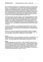 Drucksache 16/2672 Schleswig-Holsteinischer Landtag - 16. Wahlperiode ten zum riskanten Alkoholkonsum. Der proaktive Baustein greift auf der kommunalen Ebene. Er beinhaltet Maßnahmen zur konsequenten Umsetzung des Jugendschutz- gesetzes, zur Sensibilisierung von Eltern und zu einer breiten Öffentlichkeitsarbeit. Zusätzlich werden zielgruppenspezifische Präventionsprojekte mit differenzierten Schwerpunkten auf kommunaler Ebene verabredet. Im Ergebnis soll durch das Pro- jekt in Schleswig-Holstein die Risikosensibilisierung der Jugendlichen sowie das Ein- halten punktueller Abstinenz erreicht werden und auf lokaler Ebene die Verantwor- tung für die Einhaltung des Jugendschutzgesetzes gestärkt und die Entwicklung al- ternativer Feier- und Veranstaltungsmodalitäten gefördert werden. Das Projekt ist bisher mit großem Interesse in den Suchtberatungsstellen der einzel- nen Kreise Schleswig-Holsteins vorgestellt worden. Einige Städte und Kreise haben sich bereits an die aktive Umsetzung des Projektes gemacht oder zumindest Vorbe- reitungen für eine mögliche Umsetzung getroffen. Ebenso ist die Vorstellung des Projektes in den Versorgungskrankenhäusern des Landes abgeschlossen. An „Run- den Tischen“ werden unter Einbeziehung der Suchthilfe, der Krankenhäuser und von Vertretern der Kreis- und beteiligten Gemeindeverwaltungen weiterführende Aktivitä- ten geplant. Gemeinsam mit Kommunen und Krankenkassen wird darüber hinaus an einem Fi- nanzierungsmodell für den reaktiven Baustein gearbeitet, das auf unterschiedlichen Ebenen ansetzen soll. Bis Ende 2009 soll die Implementierung in Schleswig-Holstein abgeschlossen sein. Mit dem HaLT-Projekt wird das Schicksal alkoholintoxikierter Kinder und Jugendli- cher nicht mehr dem eher zufälligen Engagement Einzelner überlassen, sondern es wird ein geregeltes, verbindliches und qualifiziertes Verfahren etabliert. Frage 4 Welche Möglichkeiten sieht die Landesregierung, bei Kindern und Jugendlichen – die aufgrund von Alkohol- Drogenkonsum stationär oder ambulant behandelt werden müssen – durch aufsuchende Hilfe Aufklärungsarbeit und Prävention zu leisten? Antwort: Integraler Bestandteil des in der Antwort zu Frage 3 vorgestellten Projektes „HaLT“ ist die aufsuchende Kontaktaufnahme mit den Kindern und Jugendlichen unmittelbar am Krankenbett, das so genannte Brückengespräch. In diesem wird geprüft, welche Motive und Hintergründe dem Vorfall zugrunde liegen und ob Beratungs- oder Be- handlungsmaßnahmen angezeigt sind. In einem nachfolgenden „Risikocheck“ als Gruppenangebot wird das eigene Trinkverhalten kritisch reflektiert, um ein eigenver- antwortliches Risikobewusstsein entwickeln zu können. 4