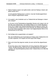 Drucksache 15/1878 Schleswig-Holsteinischer Landtag - 15. Wahlperiode 4. Welche Probleme müssen noch gelöst werden, damit der Radweg in diesem Jahr gebaut werden kann? Um den gesamten Radweg bauen zu können, muss das Verwaltungsgerichtsver- fahren erfolgreich abgeschlossen werden. 5. Ist es geplant, unter Umständen auch nur Teilabschnitte des Radweges in diesem Jahr zu bauen? Ja. Aus den von der Planfeststellung freigestellten Strecken soll in diesem Jahr mit dem Bau eines Teilabschnitts in der Ortslage Wittkiel von km 34,853 (Baubeginn) bis km 35,701 (Beginn des Plangenehmigungsverfahrens) begonnen werden. Die- ser Abschnitt wurde in Abstimmung mit der Gemeinde, der Straßenverkehrsbehör- de und der Polizei ausgewählt, weil er einen in sich abgeschlossenen Wert an Ver- kehrssicherheit mit sich bringt. 6. Sind Aufträge schon ausgeschrieben und vergeben? Nein. Die Veröffentlichung der Ausschreibung für diesen ersten Teilabschnitt ist für Juli 2002 vorgesehen. Die Vergabe soll Ende August 2002 erfolgen. 7. Wann soll mit dem Bau begonnen werden, bis wann soll der Bau abgeschlossen sein? Mit dem Bau dieses ersten Teilabschnitts soll Anfang September 2002 begonnen werden. Ab Mitte November 2002 wird eine erste Befahrbarkeit für Radfahrer vorliegen. Die Gesamtfertigstellung dieses ersten Teilabschnittes ist für Mitte Mai 2003 geplant. 2