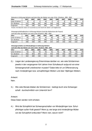 Drucksache 17/2439 Schleswig-Holsteinischer Landtag - 17. Wahlperiode Geburten in Schleswig-Holstein nach dem Alter der Mutter von unter 15 bis 18 Jahren, 2001 - 2010 Alter 2001 2002 2003 2004 2005 2006 2007 2008 2009 2010 unter 15 Jahren 6 1 5 10 1 11 3 7 9 2 15- 18 Jahren 217 238 247 246 224 216 203 220 188 192 insgesamt 223 239 252 256 225 227 206 227 197 194 Hinweis: Die Geburten setzen sich zusammen aus der Anzahl der Lebend- und Totgeborenen. Schwangerschaftsabbrüche in Schleswig-Holstein (Land des Wohnsitzes der Frauen) nach dem Alter der Mutter von unter 15 bis 18 Jahren, 2001 - 2010 Alter 2001 2002 2003 2004 2005 2006 2007 2008 2009 2010 unter 15 Jahren 25 21 28 16 30 24 25 26 26 22 15- 18 Jahren 215 229 250 269 227 243 228 217 187 172 insgesamt 240 250 278 285 257 267 253 243 213 194 Schwangerschaften von Minderjährigen in Schleswig-Holstein nach dem Alter der Mutter von unter 15 bis 18 Jahren, 2001 - 2010 Alter 2001 2002 2003 2004 2005 2006 2007 2008 2009 2010 unter 15 Jahren 31 22 33 26 31 35 28 33 35 24 15- 18 Jahren 432 467 497 515 451 459 431 437 375 364 insgesamt 463 489 530 541 482 494 459 470 410 388 2.) Liegen der Landesregierung Erkenntnisse darüber vor, wie viele Schülerinnen jeweils in den vergangenen fünf Jahren ihren Schulbesuch aufgrund von einer Schwangerschaft unterbrechen mussten? Dabei bitte ich um Differenzierung nach minderjährigen bzw. schulpflichtigen Müttern und über 18jährigen Müttern. Antwort: Nein. 3.) Wie viele Monate blieben die Schülerinnen - bedingt durch eine Schwanger- schaft - durchschnittlich vom Unterricht fern? Antwort: Diese Daten werden nicht erhoben. 4.) Wird die Schulpflicht bei Schwangerschaften von Minderjährigen bzw. Schul- pflichtigen außer Kraft gesetzt? Wenn ja, wie lange sind minderjährige Mütter von der Schulpflicht entbunden? Wenn nein, warum nicht? 2