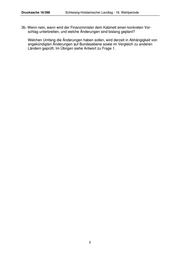 Drucksache 16/398 Schleswig-Holsteinischer Landtag - 16. Wahlperiode 3b. Wenn nein, wann wird der Finanzminister dem Kabinett einen konkreten Vor- schlag unterbreiten, und welche Änderungen sind bislang geplant? Welchen Umfang die Änderungen haben sollen, wird derzeit in Abhängigkeit von angekündigten Änderungen auf Bundesebene sowie im Vergleich zu anderen Ländern geprüft. Im Übrigen siehe Antwort zu Frage 1. 2