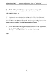 Drucksache 15/ #N!# Schleswig-Holsteinischer Landtag - 15. Wahlperiode 2. Welche Haltung nimmt die Landesregierung zu dieser Anfrage ein? Vgl. Antwort zu Frage 1 b). 3. Wie bewertet die Landesregierung die Eigentumsrechte an dem Standbild? Das Standbild wurde 1980 in das Denkmalbuch eingetragen. Als Eigentümer wurde bei der Unterschutzstellung die Stadt Eckernförde angesprochen. 4. Hat die Landesregierung in dieser Angelegenheit bereits Kontakt zu Dienststel- len des Bundes aufgenommen? Wenn ja, zu welchen Dienststellen und mit welchem Ergebnis? Nein. 2