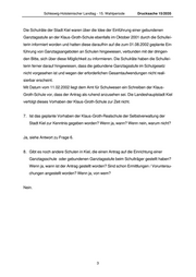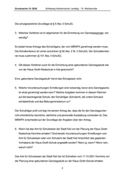 Drucksache 15/ 2035 Schleswig-Holsteinischer Landtag - 15. Wahlperiode Die schulgesetzliche Grundlage ist § 5 Abs. 5 SchulG. 3. Welches Verfahren ist im allgemeinen für die Einrichtung von Ganztagsschulen not- wendig? Es bedarf eines Antrags des Schulträgers, der vom MBWFK genehmigt werden muss. Die Schulkonferenz ist vorher anzuhören (§ 92 Abs. 2 Nr. 2 SchulG). Der Schulelternbei- rat muss zustimmen (§ 101 Abs. 4 SchulG). 4. Gilt dieses Verfahren auch für die Einrichtung einer gebundenen Ganztagsstufe wie von der Klaus-Groth-Realschule in Kiel gewünscht? Eine „gebundene Ganztagsstufe“ kennt das Schulgesetz nicht. 5. Welche Voruntersuchungen/ Ermittlungen sind notwendig, bevor eine Ganztagsschu- le/-stufe genehmigt werden kann? Welche Aufgaben kommen in diesem Rahmen auf die beantragende Schule, den Schulträger (Schulamt), die untere Schulauf- sichtsbehörde und das Bildungsministerium zu? Der Schulträger prüft und legt mit seinem Antrag dar, dass die für den Ganztagsunter- richt erforderliche räumliche, sächliche und personelle Ausstattung vorhanden ist. Das MBWFK entscheidet auf der Grundlage der Angaben über den Antrag. 6. Wann hat das Amt für Schulwesen der Stadt Kiel von der Planung der Klaus-Groth- Realschule Kenntnis erhalten? Sind bereits Voruntersuchungen/ Ermittlungen vom Amt für Schulwesen oder vom Schulamt der Stadt Kiel hinsichtlich des geplanten Vorhabens der Klaus-Groth-Schule angestellt worden? Wenn ja, wann? Wenn nein, warum nicht? Das Amt für Schulwesen der Stadt Kiel hat mit Schreiben vom 17.10.2001 Kenntnis von der Planung einer gebundenen Ganztagsstufe an der Klaus-Groth-Schule erhalten. 2
