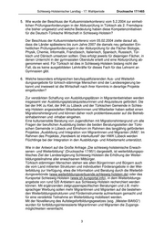Schleswig-Holsteinischer Landtag - 17. Wahlperiode Drucksache 17/1465 5. Wie wurde der Beschluss der Kultusministerkonferenz vom 5.2.2004 zur einheit- lichen Prüfungsanforderungen in der Abiturprüfung in Türkisch als 2. Fremdspra- che bisher umgesetzt und welche Bedeutung haben diese Kompetenzinitiativen für die Deutsch-Türkische Wirtschaft in Schleswig-Holstein? Der Beschluss der Kultusministerkonferenz vom 05.02.2004 zielte darauf ab, dass die Länder spätestens bis zum Jahre 2007 die damals neu gefassten Ein- heitlichen Prüfungsanforderungen in der Abiturprüfung für die Fächer Biologie, Physik, Chemie, Informatik, Französisch, Italienisch, Spanisch, Russisch, Tür- kisch und Dänisch umsetzen sollten. Dies erfolgt jeweils für diejenigen Fächer, in denen Unterricht in der gymnasialen Oberstufe erteilt und eine Abiturprüfung ab- genommen wird. Für Türkisch ist dies in Schleswig-Holstein bislang nicht der Fall, da es keine ausgebildeten Lehrkräfte für dieses Fach für das Lehramt an Gymnasien gibt. 6. Welche besonders erfolgreichen berufsqualifizierenden Aus- und Weiterbil- dungsangebote für türkisch-stämmige Menschen sind der Landesregierung be- kannt und inwieweit ist die Wirtschaft nach ihrer Kenntnis in derartige Projekte eingebunden? Zur verstärkten Schaffung von Ausbildungsplätzen in Migrantenbetrieben werden insgesamt vier Ausbildungsplatzakquisiteurinnen und Akquisiteure gefördert. Die bei der IHK zu Kiel, der IHK zu Lübeck und der Türkischen Gemeinde in Schles- wig-Holstein angesiedelten Mitarbeiterinnnen und Mitarbeiter haben selbst einen Migrationshintergrund und können daher noch problembewusster auf die Betrieb- sinhaberinnen und -inhaber eingehen. Eine kultursensible Beratung von Jugendlichen mit Migrationshintergrund um alle Fragen der beruflichen Ausbildung bieten die beiden Beratungsstellen der Türki- schen Gemeinde in Lübeck und Elmshorn im Rahmen des langjährig geförderten Projektes „Ausbildung und Integration von Migrantinnen und Migranten (AIM)“. Im Rahmen des Projektes „Handwerk ist interkulturell“ der HWK Lübeck werden Flüchtlinge bei der Integration in den Ausbildungs- und Arbeitsmarkt unterstützt. Wie in der Antwort auf die Große Anfrage „Die schleswig-holsteinische Erwach- senen- und Weiterbildung“ (Drucksache 17/951) dargestellt, ist weiterbildungspo- litisches Ziel der Landesregierung Schleswig-Holstein die Erhöhung der Weiter- bildungsteilnahme aller erwachsenen Mitbürger. Türkisch-stämmigen Menschen stehen wie allen Bürgerinnen und Bürgern auch die vom Land initiierten Strukturen und individuellen Förderangebote in der Wei- terbildung zur Verfügung, etwa die Information und Beratung durch die Weiterbil- dungsverbünde (www.weiterbildungsverbuende.schleswig-holstein.de) oder das Kursportal Schleswig-Holstein (www.sh.kursportal.info), in dem Weiterbildungs- angebote von rund 520 Anbietern aus Schleswig-Holstein recherchiert werden können. Mit ergänzenden zielgruppenspezifischen Beratungen und z.B. mehr- sprachiger Werbung sollen mehr Migrantinnen und Migranten auf die bestehen- den Weiterbildungsstrukturen und Förderinstrumente aufmerksam gemacht und für eine verstärkte Teilnahme an Weiterbildung mobilisiert werden. Mit der Novellierung des Aufstiegsfortbildungsgesetzes (sog. „Meister-BAföG“) wurden für fortbildungsinteressierte Migrantinnen und Migranten die Zugangs- möglichkeiten vereinfacht. 3