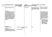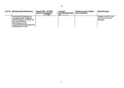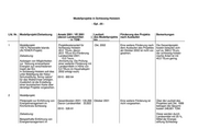 Drucksache 15/1148 Schleswig-Holsteinischer Landtag - 15. Wahlperiode Modellprojekte in Schleswig-Holstein - Epl. .06 - Lfd. Nr. Modellprojekt/Zielsetzung Ansatz 2001 / VE 2001 Laufzeit Förderung des Projekts Bemerkungen (davon Landesmittel: ) des Modellprojekts nach Auslaufen - in TDM - bis ................ 1 Modellprojekt: Der GA- Planungsausschuss Nichtinvestive Förderung im 2.396 Bewilligung vorauss. wird im Jahr 2002 darüber Rahmen der Gemeinschafts- VE: 2.440 bis 31.12.2002; zu beschließen haben, ob aufgabe „Verbesserung der Durchführung bis die GA offiziell eine nicht- regionalen Wirtschaftsstruktur“ 0603 - 683 01 vorauss. 31.12.2006 investive Förderlinie (GA) erhalten soll. Zielsetzung: Stärkung der Wettbewerbsfä- Es handelt sich um eine higkeit und Anpassungsfähigkeit Anschubfinanzierung, weite- von kleinen und mittleren Unter- re Förderungen – z. B. zur nehmen. Es werden Zuwen- Markteinführung neuer Pro- dungen für arbeitsplatzschaf- dukte – sind aus anderen fende und betriebliche Innovati- Programmen möglich. onen gewährt. Außerdem wer- den betriebliche Beratungen für Unternehmen in Schwierigkei- ten angeboten. 2 Modellprojekt: Regionalmanagement im Rah- 0 Bewilligung bis Eine fortlaufende institutio- Es handelt sich um einen men der Gemeinschaftsaufga- 31.12.2003, Durch- nelle Förderung ist nicht Leertitel. Die erforderli- be „Verbesserung der regiona- 0603 - 633 01 führung bis max. vorgesehen. Die Projektträ- chen Mittel werden im len Wirtschaftsstruktur“ (GA) 31.12.2006 ger entscheiden über die Rahmen der Deckungs- 4