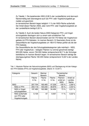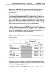 Schleswig-Holsteinischer Landtag - 17. Wahlperiode Drucksache 17/2322 4. Wie hoch war dabei jeweils der Anteil/Umfang landwirtschaftlich genutzter Flächen (in ha insgesamt und in Prozentanteil jeweils an den Schutzge- bietskategorien)? Es liegen keine Zahlen vor, die den o.g. Zeiträumen exakt entsprechen. Als systematisch landesweit vorliegende und hinsichtlich der Typisierung ver- gleichbare Datengrundlage konnten für einen Zeitpunkt um 1991 lediglich die CIR-Luftbildgestützte Biotop- und Nutzungstypenkartierung (Luftbilder aus dem Zeitraum 1989 – 1991) sowie für einen Zeitpunkt um 2011 die Daten des Digitalen Basis-Landschaftsmodells (Basis-DLM) mit dem Themenlayer Vege- tation/Landwirtschaftliche Nutzfläche (VEG01) verwendet werden. Aus diesen Daten kann nicht eindeutig abgeleitet werden, ob die entspre- chenden „landwirtschaftlichen Nutzflächen“ (nur diese konnten erfasst werden) tatsächlich zum jeweiligen Zeitpunkt landwirtschaftlich genutzt wurden oder sie bereits, eventuell seit längerem, ungenutzt waren. Dies gilt insbesondere für das Feucht- und Nassgrünland sowie die Salzwiesen. Tab. 6: Landwirtschaftliche Nutzflächen in den Schutzgebieten NSG, FFH- und Vo- gelschutz-Gebieten Kategorie Landwirtschaftliche Nutzfläche in Schutzgebieten um 1991 um 2011 Anteil Anteil NSG 10.907 ha 33,4 % 17.441 ha 38,0 % NSG in FFH 13.780 ha 34,6 % NSG in Vogelschutz 12.645 ha 36,7 % FFH 40.597 ha 35,7 % Vogelschutz 47.517 ha 45,3 % Natura 2000 65.231 ha 42,0 % Natura 2000 + NSG 68.214 ha 42,5 % außerhalb 5. In welchem Umfang wurden seit ca. 1980 ursprünglich landwirtschaftlich ge- nutzte Flächen aufgrund der Schutzausweisung vollständig aus einer landwirt- schaftlichen Nutzung herausgenommen? Von 1980 bis 2011 wurden 102 NSG neu ausgewiesen. In diesem Zeitraum 5