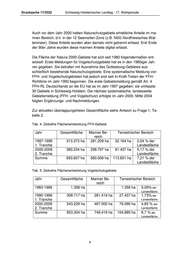 Drucksache 17/2322 Schleswig-Holsteinischer Landtag - 17. Wahlperiode Auch vor dem Jahr 2000 hatten Naturschutzgebiete erhebliche Anteile im ma- rinen Bereich, d.h. in der 12 Seemeilen-Zone (z.B. NSG Nordfriesisches Wat- tenmeer). Diese Anteile wurden aber damals nicht getrennt erfasst. Erst Ende der 90er Jahre wurden diese marinen Anteile digital erfasst. Die Fläche der Natura 2000-Gebiete hat sich seit 1980 folgendermaßen ent- wickelt: Erste Meldungen für Vogelschutzgebiete hat es in den 1980iger Jah- ren gegeben. Sie betrafen mit Ausnahme des Gotteskoog-Gebietes aus- schließlich bestehende Naturschutzgebiete. Eine systematische Meldung von FFH- und Vogelschutzgebieten hat jedoch erst seit In-Kraft-Treten der FFH- Richtlinie im Jahr 1992 begonnen. Die erste Gebietsmeldung gemäß Art. 4 FFH-RL Deutschlands an die EU hat es im Jahr 1997 gegeben; sie umfasste 30 Gebiete in Schleswig-Holstein. Die nächste systematische, landesweite Gebietsmeldung (FFH- und Vogelschutz) erfolgte im Jahr 2000. Mitte 2004 folgten Ergänzungs- und Nachmeldungen. Zur aktuellen überlappungsfreien Gesamtfläche siehe Antwort zu Frage 1, Ta- belle 2. Tab. 4: Zeitreihe Flächenentwicklung FFH-Gebiete Jahr Gesamtfläche Mariner Be- Terrestrischer Bereich reich 1997-1999 313.373 ha 281.209 ha 32.164 ha 2,04 % der 1. Tranche Landesfläche 2000-2009 380.234 ha 298.797 ha 81.437 ha 5,17 % der 2. Tranche Landesfläche Summe 693.607 ha 580.006 ha 113.601 ha 7,21 % der Landesfläche Tab. 5: Zeitreihe Flächenentwicklung Vogelschutzgebiete Jahr Gesamtfläche Mariner Be- Terrestrischer Bereich reich 1983-1989 1.358 ha - 1.358 ha 0,09% der Landesfläche 1990-1999 308.717 ha 281.419 ha 27.437 ha 1,73% der 1. Tranche Landesfläche 2000-2009 543.229 ha 467.000 ha 76.090 ha 4,83 % der 2. Tranche Landesfläche Summe 853.304 ha 748.419 ha 104.885 ha 6,7 % der Landesfläche 4