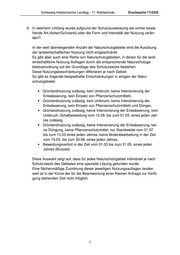 Schleswig-Holsteinischer Landtag - 17. Wahlperiode Drucksache 17/2322 6. In welchem Umfang wurde aufgrund der Schutzausweisung die vorher beste- hende Art (Acker/Grünland) oder die Form und Intensität der Nutzung verän- dert? In der weit überwiegenden Anzahl der Naturschutzgebiete wird die Ausübung der landwirtschaftlichen Nutzung nicht eingeschränkt. Es gibt aber auch eine Reihe von Naturschutzgebieten, in denen für die land- wirtschaftliche Nutzung Auflagen durch die entsprechende Naturschutzge- bietsverordnung auf der Grundlage des Schutzzwecks bestehen. Diese Nutzungsbeschränkungen differieren je nach Gebiet. So gibt es folgende beispielhafte Einschränkungen in einigen der Natur- schutzgebiete: • Grünlandnutzung zulässig, kein Umbruch, keine Intensivierung der Entwässerung, kein Einsatz von Pflanzenschutzmitteln, • Grünlandnutzung zulässig, kein Umbruch, keine Intensivierung der Entwässerung, kein Einsatz von Pflanzenschutzmitteln und Dünger, • Grünlandnutzung zulässig, keine Intensivierung der Entwässerung, kein Umbruch, Schafbeweidung vom 15.08. bis zum 01.03. eines jeden Jah- res zulässig, • Grünlandnutzung zulässig, keine Intensivierung der Entwässerung, kei- ne Düngung, keine Pflanzenschutzmittel, nur Standweide vom 01.07. bis zum 15.03 eines jeden Jahres, keine Bodenbearbeitung in der Zeit vom 15.03. bis zum 30.06. eines jeden Jahres, • Beweidungsverbot in der Zeit vom 01.03 bis zum 31.05. eines jeden Jahres (Brutzeit). Diese Auswahl zeigt auf, dass für jedes Naturschutzgebiet individuell je nach Schutzzweck des Gebietes eine spezielle Lösung gefunden wurde. Eine flächenmäßige Zuordnung dieser jeweiligen Nutzungsauflagen landes- weit ist in der Kürze der für die Beantwortung einer Kleinen Anfrage zur Verfü- gung stehenden Zeit nicht möglich. 7