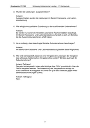 Drucksache 17/1792 Schleswig-Holsteinischer Landtag - 17. Wahlperiode 3. Wurden die Leistungen ausgeschrieben? Antwort: Ausgeschrieben wurden die Leistungen im Bereich Karosserie- und Lackin- standsetzung. 4. Wie erfolgt eine qualitative Zuordnung zu den ausführenden Unternehmen? Antwort: Es werden nur durch die Hersteller autorisierte Fachwerkstätten beauftragt. Im Bereich Karosserie- und Lackinstandsetzung handelt es sich um Betriebe, die die Ausschreibungskriterien erfüllt haben. 5. Ist es zulässig, dass beauftragte Betriebe Subunternehmen beauftragen? Antwort: Im Bereich der Karosserie- und Lackinstandsetzung besteht diese Möglichkeit. 6. Wie wird sichergestellt, dass bei einer Vergabe der Leistungen die Vorgaben des schleswig-holsteinischen Vergaberechts werden? Gilt dies auch ggf. für Subunternehmen? Antwort Teilfrage1: Dies wird sichergestellt, indem alle Aufträge über 750 € grundsätzlich über die GMSH vergeben werden. Die Anwendung des Vergaberechts erfolgt nur durch öffentliche Auftraggeber im Sinne von § 98 des Gesetzes gegen Wett- bewerbsbeschränkungen (GWB). Antwort Teilfrage 2: Nein. 2