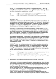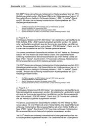 Drucksache 16/120 Schleswig-Holsteinischer Landtag - 16. Wahlperiode 5. 569.000 Hektar der schleswig-holsteinischen Küstengewässer sind als FFH- Gebiete gemeldet worden. Die Gesamtfläche der Küstengewässer bis zur 12- 6. Seemeilen-Grenze beträgt in Schleswig-Holstein 1.068.116 Hektar . Damit sind 53,3 Prozent der schleswig-holsteinischen Küstengewässer als FFH- Gebiete gemeldet worden. *1., 5. Die Flächenangaben der FFH-Gebiete sind auf 1000 Hektar gerundet Quelle: Bundesamt für Naturschutz 2005 2. Quelle: Statistisches Jahrbuch Schleswig-Holstein 2003 3., 4., 6. Quelle: Landesamt für Natur und Umwelt des Landes Schleswig-Holstein 2005 zu Frage 1. b.:* 1. In Schleswig-Holstein sind 101.000 Hektar der statistischen Landesfläche als EGV-Gebiete (EGV = EG-Vogelschutzgebiet) gemeldet worden. Die statisti- sche Landesfläche ergibt sich aus der Summe der eigentlichen Landflächen 2. und der Binnenwasserflächen und umfasst 1.576.300 Hektar . Damit sind 6,4 Prozent der Landesfläche als EGV-Gebiete gemeldet worden. 3. Von dieser gemeldeten Gesamtfläche entfallen 18.000 Hektar auf Binnenge- wässer mit einer Fläche ab einem Hektar Größe. Die Gesamtfläche der schleswig-holsteinischen Binnenwasserflächen ab einem Hektar Größe um- 4. fasst 57.937 Hektar . Damit sind 31,1 Prozent der schleswig-holsteinischen Binnenwasserflächen als EGV-Gebiete gemeldet worden. 5. 738.000 Hektar der schleswig-holsteinischen Küstengewässer sind als EGV- Gebiete gemeldet worden. Die Gesamtfläche der Küstengewässer bis zur 12- 6. Seemeilen-Grenze beträgt in Schleswig-Holstein 1.068.116 Hektar . Damit sind 69,1 Prozent der schleswig-holsteinischen Küstengewässer als EGV- Gebiete gemeldet worden. *1., 5. Die Flächenangaben der EGV-Gebiete sind auf 1000 Hektar gerundet Quelle: Bundesamt für Naturschutz 2005 2. Quelle: Statistisches Jahrbuch Schleswig-Holstein 2003 3., 4., 6. Quelle: Landesamt für Natur und Umwelt des Landes Schleswig-Holstein 2005 zu Frage 1. c.:* 1. In Schleswig-Holstein sind 45.000 Hektar der statistischen Landesfläche als Naturschutzgebiete ausgewiesen worden. Die statistische Landesfläche ergibt sich aus der Summe der eigentlichen Landflächen und der Binnenwasserflä- 2. chen und umfasst 1.576.300 Hektar . Damit sind 2,9 Prozent der Landesflä- che als Naturschutzgebiete ausgewiesen worden. 3. Von dieser ausgewiesenen Gesamtfläche entfallen 10.000 Hektar auf Bin- nengewässer mit einer Fläche ab einem Hektar Größe. Die Gesamtfläche der schleswig-holsteinischen Binnenwasserflächen ab einem Hektar Größe um- 4. fasst 57.937 Hektar . Damit sind 17,3 Prozent der schleswig-holsteinischen Binnenwasserflächen als Naturschutzgebiete ausgewiesen worden. 5. 160.000 Hektar der schleswig-holsteinischen Küstengewässer sind als Na- turschutzgebiete ausgewiesen worden. Die Gesamtfläche der Küstengewäs- 2