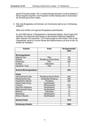 Drucksache 16/120 Schleswig-Holsteinischer Landtag - 16. Wahlperiode gischer Prozesse wieder. Die in vergleichsweise geringem Umfang stattgefun- denen illegalen Eingriffe in die Population d ürften bislang keinen nennenswer- ten Einfluss genommen haben. 3. Wie viele Brutgebiete und Kolonien von Kormoranen gibt es wo in Schleswig- Holstein? (Bitte nach Größe und Lage der Brutgebiete aufschlüsseln). Im Jahr 2004 gab es 15 Brutkolonien in Schleswig-Holstein. Davon lagen fünf Kolonien mit zusammen 833 Paaren im Binnenland (Östliches Hügelland). Zehn Kolonien mit zusammen 1.972 Paaren lagen an den Küsten: Drei an der Ostseeküste, sechs im und am Rande des Wattenmeeres und eine an der Un- terelbe bei Haseldorf. Kolonie Kreis Brutpaaranzahl 2004 Binnengewässer Selenter See Plön 90 Stoffsee Rendsburg-Eckernförde 190 Heidensee Plön 542 Kuhlsee Ostholstein 3 Güsdorfer Teich Plön 8 Summe Binnengewässer 833 Küste Hemmelmarker See Rendsburg-Eckernförde 505 Westerwerker See Schleswig-Flensburg 690 Haseldorfer Marsch Pinneberg 300 Hauke-Haien-Koog Nordfriesland 1 Trischen Dithmarschen 274 Wyk/Föhr Klärteiche Nordfriesland 135 Beltringharder Koog Nordfriesland 2 Wallnau Ostholstein 15 Buttersand Nordfriesland 37 Rantum Becken Nordfriesland 13 Summe Küste 1972 Schleswig-Holstein 2805 4