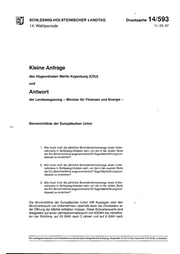 SCHLESWIG-HOLSTEINISCHER LANDTAG Drucksache 14/593 14. Wahlperiode 11.03.97 Kleine Anfrage des Abgeordneten Martin Kayenburg (CDU) und Antwort der Landesregierung - Minister für Finanzen und Energie - Stromrichtlinie der Europäischen Union 1. Wie hoch muß die jährliche Stromabnahmemenge eines Unter· nehmen$ in Schleswig·Holstein sein, um die in der ersten Stufe der EU-Stromrichtlinie angenommene23-%i.ge Marktöffnung bun- desweit zu erreichen? · 2. Wie hoch muß die jährliche Stromabnahmemenge eines Unter· nehmens in Schleswig·Holstein sein, um die in der zweiten Stufe der EU-Stromrichtlinie angenommene 27·%ige Marktöffnung bun· desweit zu erreichen? 3. Wie hoch muß die jährliche Stromabnahmemenge eines Unter- nehmens in Schleswig·Holstein sein, um die in der dritten Stufe der EU·Stromrichtlinie angenommene 33-%ige Marktöffnung bun- desweit zu erreichen? Die Stromrichtline der Europäischen Union trifft Aussagen über den Stromverbrauch von Unternehmen, oberhalb derer sie mindestens an der Öffnung der Märkte teilhaben müssen. Diese Schwellenwerte sind festgesetzt auf einen Jahresstromverbrauch von 40GWh bei lnkrafttre- ten der Richtlinie, auf 20 GWh nach 3 Jahren und auf 9 GWh nach Oie Landtagsdrucksachen sind fortlaufend und einzeln beim Verlag Schmidt & Klaunig, Ringstraße 19,24114 Kiel, Fernruf 04 31/6 20 95, zu beziehen.