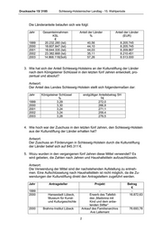 Drucksache 15/ 3185 Schleswig-Holsteinischer Landtag - 15. Wahlperiode Die Länderanteile belaufen sich wie folgt: Jahr Gesamteinnahmen Anteil der Länder Anteil der Länder KSL % (EUR) € 1999 20.232.280 (Ist) 40,56 8.205.745 2000 18.607.847 (Ist) 44,10 8.205.745 2001 18.644.335 (Ist) 44,03 8.209.867 2002 23.382.668 (Ist) 35,11 8.210.451 2003 14.868.118(Soll) 57,26 8.513.000 3. Wie hat sich der Anteil Schleswig-Holsteins an der Kulturstiftung der Länder nach dem Königsteiner Schlüssel in den letzten fünf Jahren entwickelt, pro- zentual und absolut? Antwort: Der Anteil des Landes Schleswig-Holstein stellt sich folgendermaßen dar: Jahr Königsteiner Schlüssel endgültiger Anteilsbetrag SH % T€ 1999 3,29 272,0 2000 3,30 266,9 2001 3,24 271,1 2002 3,24 259,4 2003 3,28 279,5 4. Wie hoch war der Zuschuss in den letzten fünf Jahren, den Schleswig-Holstein aus der Kulturstiftung der Länder erhalten hat? Antwort: Der Zuschuss an Förderungen in Schleswig-Holstein durch die Kulturstiftung der Länder belief sich auf 845.311 €. 5. Wozu wurden in den vergangenen fünf Jahren diese Mittel verwendet? Es wird gebeten, die Zahlen nach Jahren und Haushaltstiteln aufzuschlüsseln. Antwort: Die Verwendung der Mittel sind der nachstehenden Aufstellung zu entneh- men. Eine Aufschlüsselung nach Haushaltstiteln ist nicht möglich, da die Zu- wendungen der Kulturstiftung direkt den Antragstellern zugeführt werden. Jahr Antragsteller Projekt Betrag € 1999 - - 2000 Hansestadt Lübeck, Erwerb des Tafelbil- 16.872,63 Museum für Kunst- des „Madonna mit und Kulturgeschichte Kind und dem anbe- tenden Stifter“ 2000 Brahms-Institut Lübeck Ankauf des Familienarchivs 76.693,78 Ave Lallemant 2