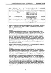 Schleswig-Holsteinischer Landtag - 15. Wahlperiode Drucksache 15/ 3185 2001 Stadt Lübeck, Museum für Erwerb einer Lübecker Sil- 434.598,10 Kunst- und Kulturgeschichte bersammlung 2002 Kulturstiftung der Hansestadt Ankauf einer Auswahl des 255.646,00 Lübeck literarischen Vorlasses, vor- wiegend bildkünstlerischer Arbeiten von Günter Grass 2003 Kunsthalle zu Kiel Erwerb des Gemäldes von 30.000,00 Christian Rohlfs „Kiefern- stämme im Sonnenlicht“ 2003 Brahms-Institut Lübeck Erwerb des Autographs eines 31.500,00 Brahms-Liedes („Liebesglut“ op. 47/2) 6. Welche Konsequenzen wird der geplante Rückzug des Bundes ab dem Jahre 2005 aus der Finanzierung der Kulturstiftung der Länder insgesamt und für Schleswig-Holstein haben? Antwort: Unmittelbare Konsequenzen ergeben sich nicht. Zu unterscheiden ist zwi- schen dem „Abkommen zur Errichtung der Kulturstiftung der Länder“, das die 11 „alten“ Länder am 04.06.1987 geschlossen haben (die 5 neuen Länder sind ihm am 26.02.1992 beigetreten) und dem „Abkommen über die Mitwir- kung des Bundes an der Kulturstiftung der Länder“ vom gleichen Tag. Der Bund hat dieses „Mitwirkungsabkommen“ zum 31.12.2003 mit Wirkung zum 31.12.2005 gekündigt. Die von den Ländern mit dem Errichtungsabkommen eingegangenen finanziellen Verpflichtungen hinsichtlich der satzungsgemä- ßen Aufgaben der Stiftung - ohne diejenigen gemäß Mitwirkungsabkommen - sind hiervon nicht betroffen. 7. Welche Auffassung hat die Landesregierung zur geplanten Fusion der Kultur- stiftung von Bund und Ländern (bitte begründen)? Antwort: Schleswig-Holstein steht einer Fusion der Kulturstiftung von Bund und Län- dern weiterhin positiv gegenüber und hat die bisher erarbeiteten (Kompromiß-) Vorschläge mitgetragen. Schleswig-Holstein war darüber hinaus an der Erar- beitung von Finanzierungsgrundsätzen für die gemeinsame Stiftung beteiligt. Eine gemeinsame Kulturstiftung wäre ein Bekenntnis zur Zusammenarbeit zwischen Bund und Ländern in der Kulturförderung und zur Idee eines koope- rativen Kulturföderalismus auf der Grundlage einer grundsätzlichen Trennung und klaren Zuordnung von Kompetenzen und Verantwortlichkeiten. Die Stär- kung der Kulturstaatlichkeit Deutschlands und die Förderung des kulturellen Lebens im Innern und nach außen ist gemeinsame politische Aufgabe von Bund und Ländern im Rahmen ihrer jeweiligen Verantwortung - eine gemein- same Kulturstiftung des Bundes und der Länder wäre die dafür geeignete In- stitution. 3