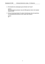 Drucksache 15/ 3185 Schleswig-Holsteinischer Landtag - 15. Wahlperiode 8. Wie bewertet die Landesregierung das Scheitern der Fusion? Antwort: Die Landesregierung bedauert, dass die Stiftungsfusion bisher nicht realisiert werden konnte. 9. Wird sich Schleswig-Holstein für weitere Verhandlungen über eine gemeinsa- me Kulturstiftung des Bundes und der Länder stark machen? Antwort: Ja. 4